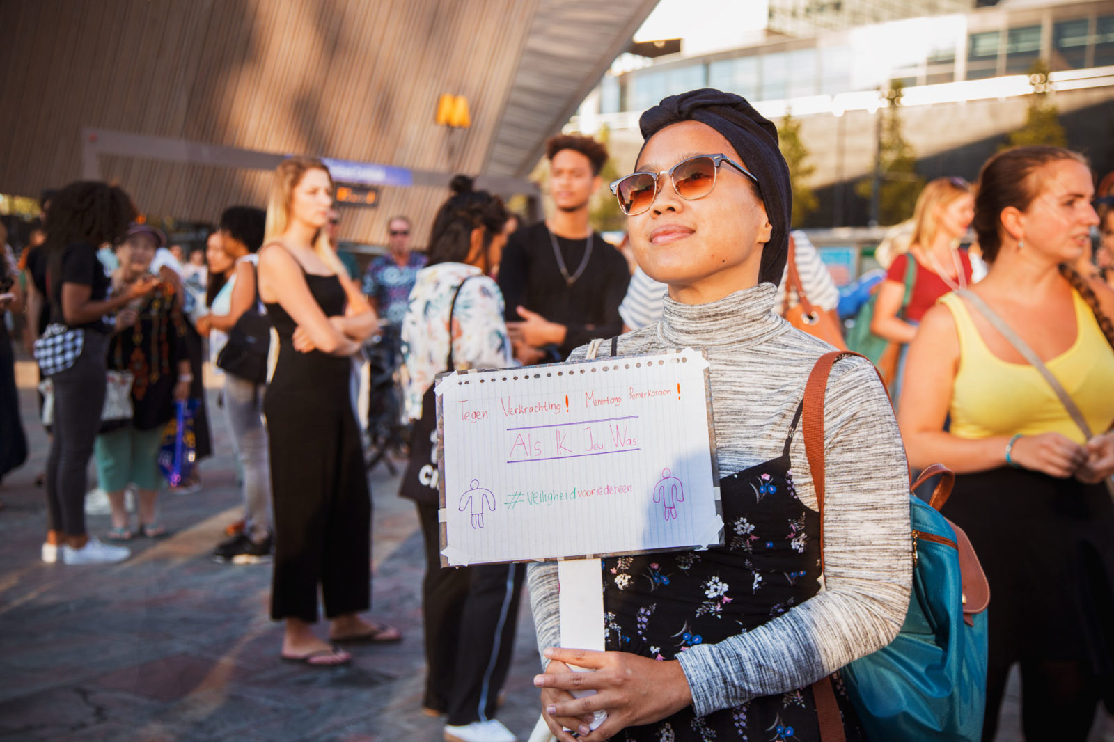 Rond half acht loopt het Stationsplein van Rotterdam CS vol met mensen. Hier begint over een half uur de stille tocht, die georganiseerd is naar aanleiding van de verkrachting van een Indonesische EUR-studente in de wijk De Esch op 21 juli. Politieagenten staan paraat op hun fietsen. Terwijl de organisatoren interviews geven aan de media, doen enkele deelnemers nog wat laatste aanpassingen aan hun meegenomen borden en spandoeken. Daarop staan teksten als ‘No=No’, ‘I am a person, not a piece of meat’ en ‘We are not objects’.