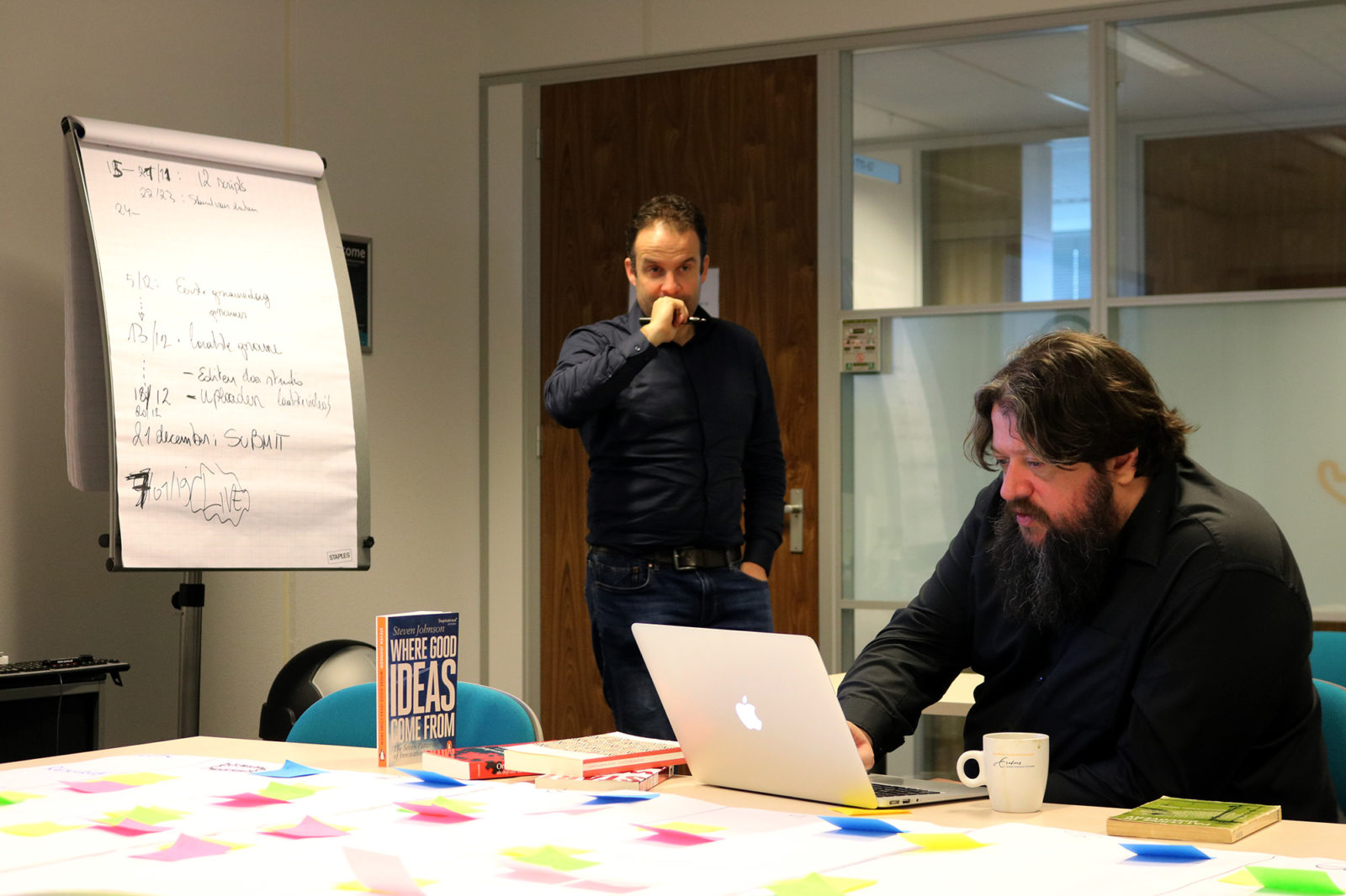 Na anderhalve dag ‘storyboarden’ liggen alle post-its op de juiste plek. Maar daarmee is de MOOC nog niet klaar. In de komende zes weken moeten ze 24 scripts voor video’s van vijf tot tien minuten schrijven, de video’s opnemen in het nieuwe Education Lab, bijbehorende opdrachten, vragen en quizzen bedenken, literatuur vinden, de leerdoelen en de verschillende video’s beschrijven, interviewfragmenten uitzoeken en de MOOC ‘bouwen’ op Coursera. Dat doet De Mey niet alleen. Hij schrijft de scripts en staat uiteindelijk voor de camera. In de tussentijd zijn er naast de onderwijskundigen ook een vormgever, cameraman en mensen van de nieuwe studio betrokken bij het maken van de MOOC. En gelukkig is er een PhD-student voor de rotklusjes: “Had hij er vandaag maar bij moeten zijn.”