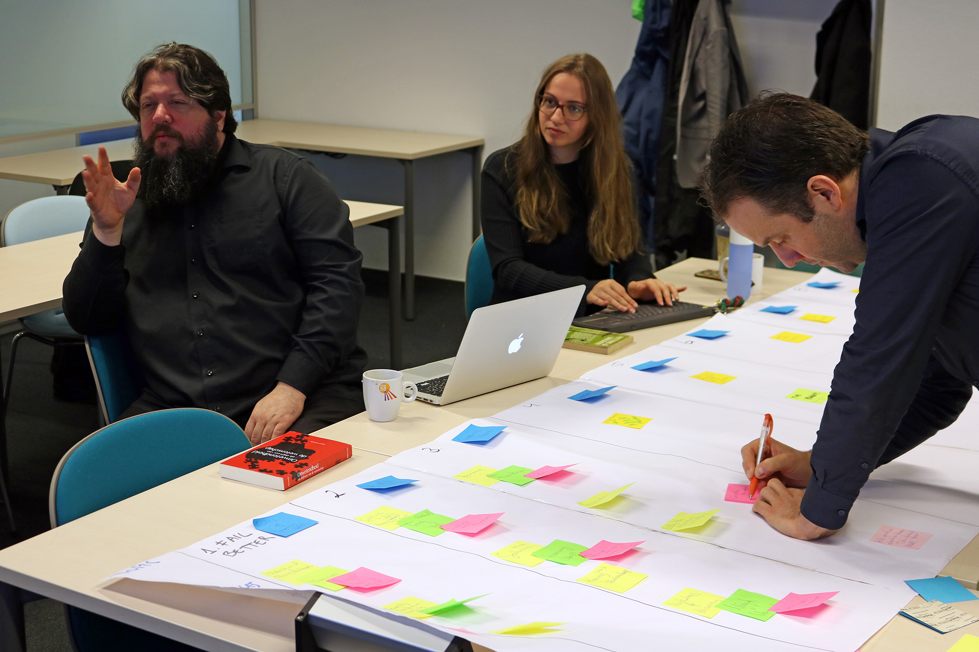 “Het fijne aan deze vorm is dat studenten alle theorie al gehad hebben voor het college. Daardoor kun je tijdens colleges meer de diepte in”, legt De Mey uit. Bovendien denkt hij dat goed gemaakte video’s een waardevolle aanvulling zijn op de reguliere literatuur. Tijdens de storyboardingsessie bespreken ze regelmatig hoe ze de aandacht van studenten zo lang mogelijk vast kunnen houden, door te spelen met de lengte en de vormgeving van de video. Meerdere keren wordt de volgorde van de gekleurde post-its omgegooid. “Stop! Stop! Stop!”, roept De Mey op zo’n moment. “Eigenlijk hoort dit bij het vorige onderwerp.” En dan kunnen Stabel en Van Leeuwen weer gaan puzzelen.