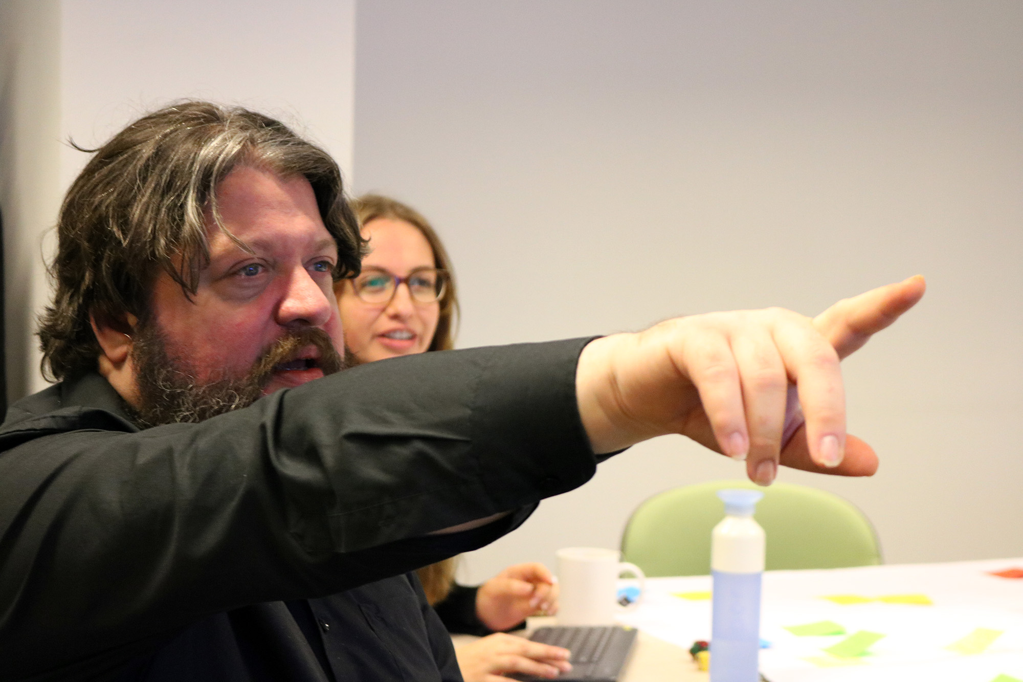 Kris Stabel, projectleider online onderwijs, en universitair docent Theoretische filosofie Tim De Mey (achter de laptop) tijdens een 'storyboardingsessie' voor de nieuwe MOOC van De Mey