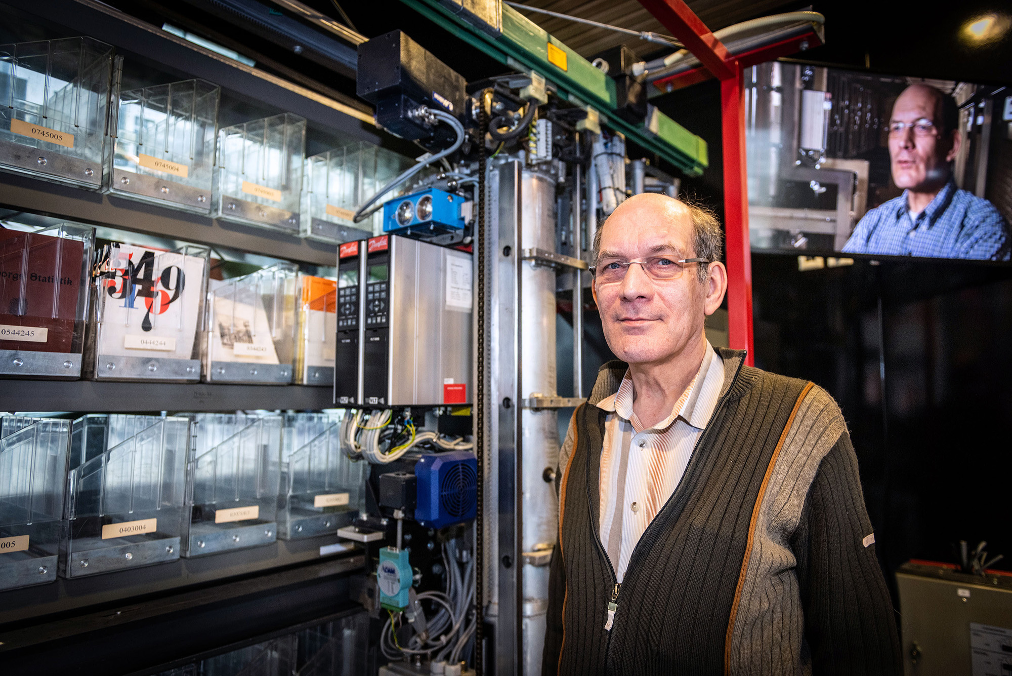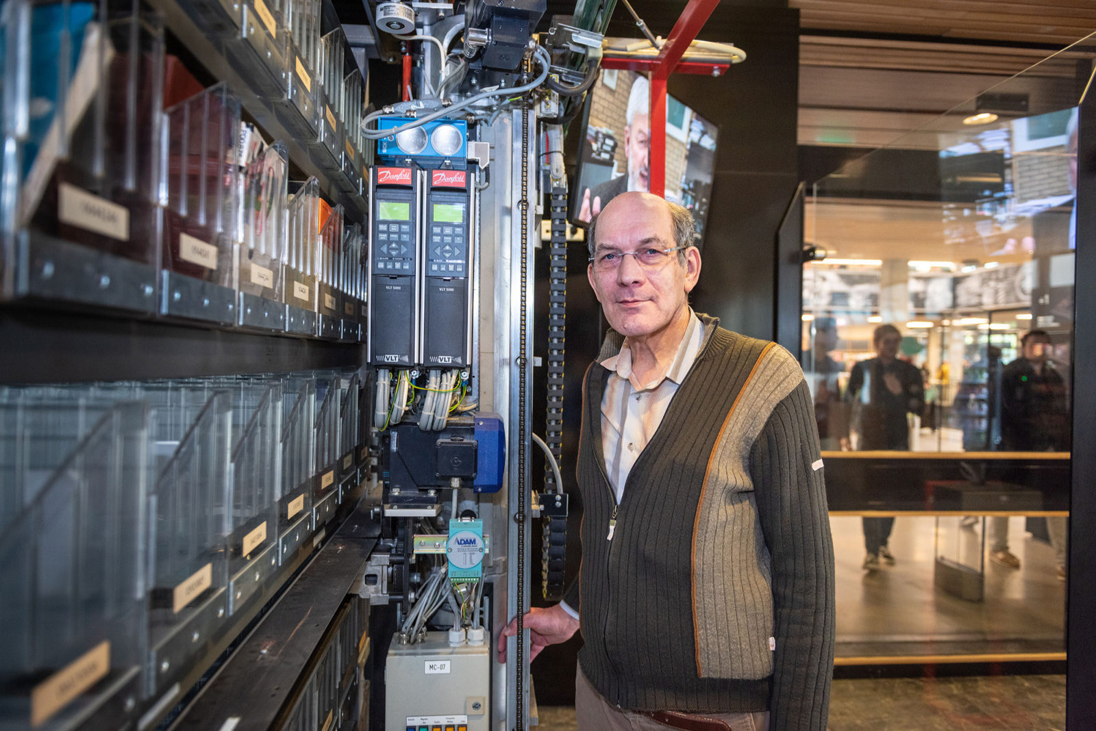 Of hij wat voelt voor die machine? Dat is wel een beetje overdreven, zegt Leen Meijboom (70). Maar toen hij in 2016 ‘de rommel’ in de containers aantrof, moest hij ‘toch wel even slikken’. 2016 was het jaar dat de Universiteitsbibliotheek volop in verbouwing was. De boekenrobot – of ‘Randtriever’, zoals de installatie officieel heet en zoals Leen het noemt – moest eruit. Niet meer rendabel. “Er werden te weinig boeken geleend door de studenten. De bibliotheek werd meer en meer een mediatheek.”