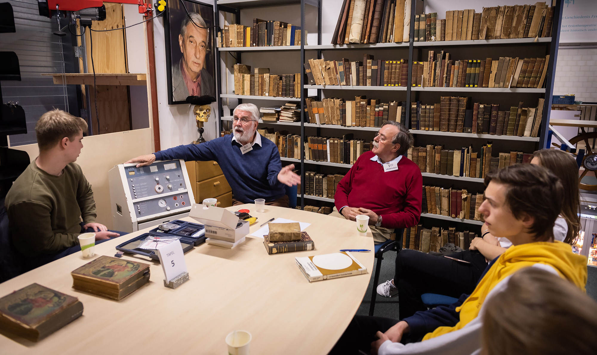 Vandaag zijn dat er een kleine honderd van de bachelor Klinische Technologie. D-day, noemt Van Lieburg de dag waarop hij elk jaar de studenten ontvangt van de opleiding die de universiteiten van Delft, Leiden en Rotterdam samen hebben opgezet. Terwijl hij voor de ene helft van de groep de dag opent met een college over het belang van ‘Urk’ (“PDF-kennis is slechts een druppeltje van de kennis die in boeken is verzameld”), is de andere helft van de studenten kriskras door de loodsen verspreid. Tientallen vrijwilligers – grotendeels gepensioneerde artsen – vertellen tussen hun eigen boeken en instrumenten over het vakgebied.