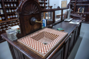 Een loods verderop laat Peter Wittop Koning (74) vol trots de Rotterdamse apotheek uit de negentiende eeuw zien. De ICT-specialist met een verleden in de medische wereld kwam terecht bij het Trefpunt toen een antieke computer uit een apotheek op straat dreigde te belanden. “Dat kon ik echt niet aanzien. Daarom ben ik uiteindelijk hier naar toe gekomen. Ik ben blijven hangen als vrijwilliger. Archiefwerk of soms wat klussen.”