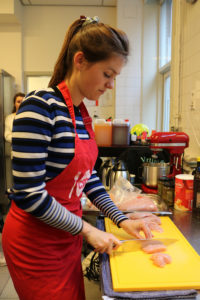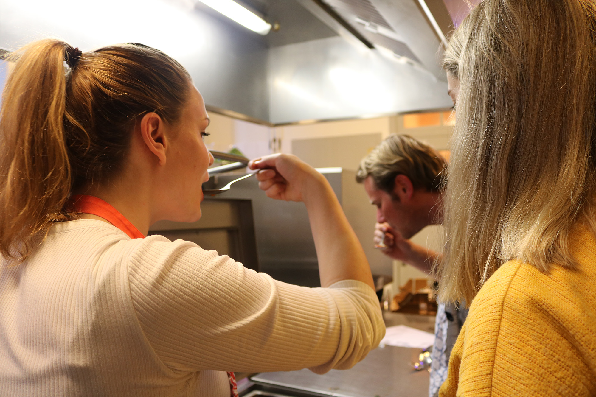 Het diner gaat bijna beginnen en de sfeer in de keuken wordt hectischer. Met behulp van de kok van CVD snijden de studenten kip in stukken, koken ze groenten en bakken baguettes in de oven. De keuken raakt gevuld met enthousiast gepraat en heerlijke geuren uit de grote pannen op het fornuis. De gasten gaan aan tafel, waarna het eten wordt geserveerd. De studenten brengen volle kommen soep en borden met spaghetti rond en voeren gesprekken met de daklozen.