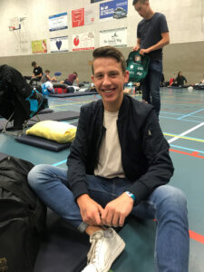 De 18-jarige Bram Louwerens begint in september met zijn studie Bedrijfskunde en heeft, in tegenstelling tot Eva, heerlijk geslapen in de sporthal. “Het was alleen een beetje kort, want ik had wel verwacht dat we iets later op mochten staan. De slaapmat vind ik heel fijn liggen, ik pak er thuis ook vaak één om op te slapen. Gisteren was het een enorm lange dag. Ik moest vroeg opstaan om van Venlo naar Rotterdam te reizen, maar ik heb de dag goed afgesloten in de Skihut. Na de Skihut vond ik het wel tijd om weg te gaan. Ik was één van de eerste die ’s avonds in de sporthal was, dus ik heb eigenlijk geen last gehad van lawaai. Nog wat extra uurtjes slaap zou niet verkeerd zijn, maar ik heb nu vooral zin in het ontbijt.”