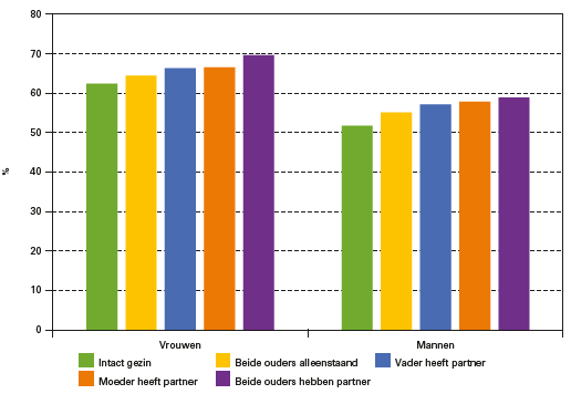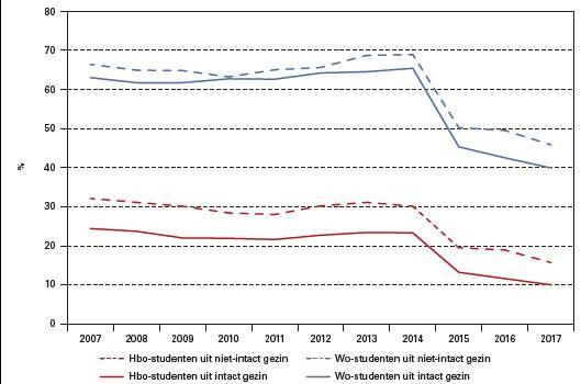 Hoe complexer de samenstelling van het gezin, des te groter de kans dat studenten op zichzelf gaan wonen. Hebben beide ouders een nieuwe partner, dan gaat 33 procent van de vrouwelijke hbo-studenten uit huis en 22 procent van de mannelijke hbo-studenten. Bij intacte gezinnen is dat respectievelijk 25 en 15 procent. Onder wo-studenten is dit aandeel bij gebroken gezinnen 70 procent (vrouwen) en 59 procent (mannen) tegen respectievelijk 62 procent en 52 procent bij intacte gezinnen (zie figuur 2).