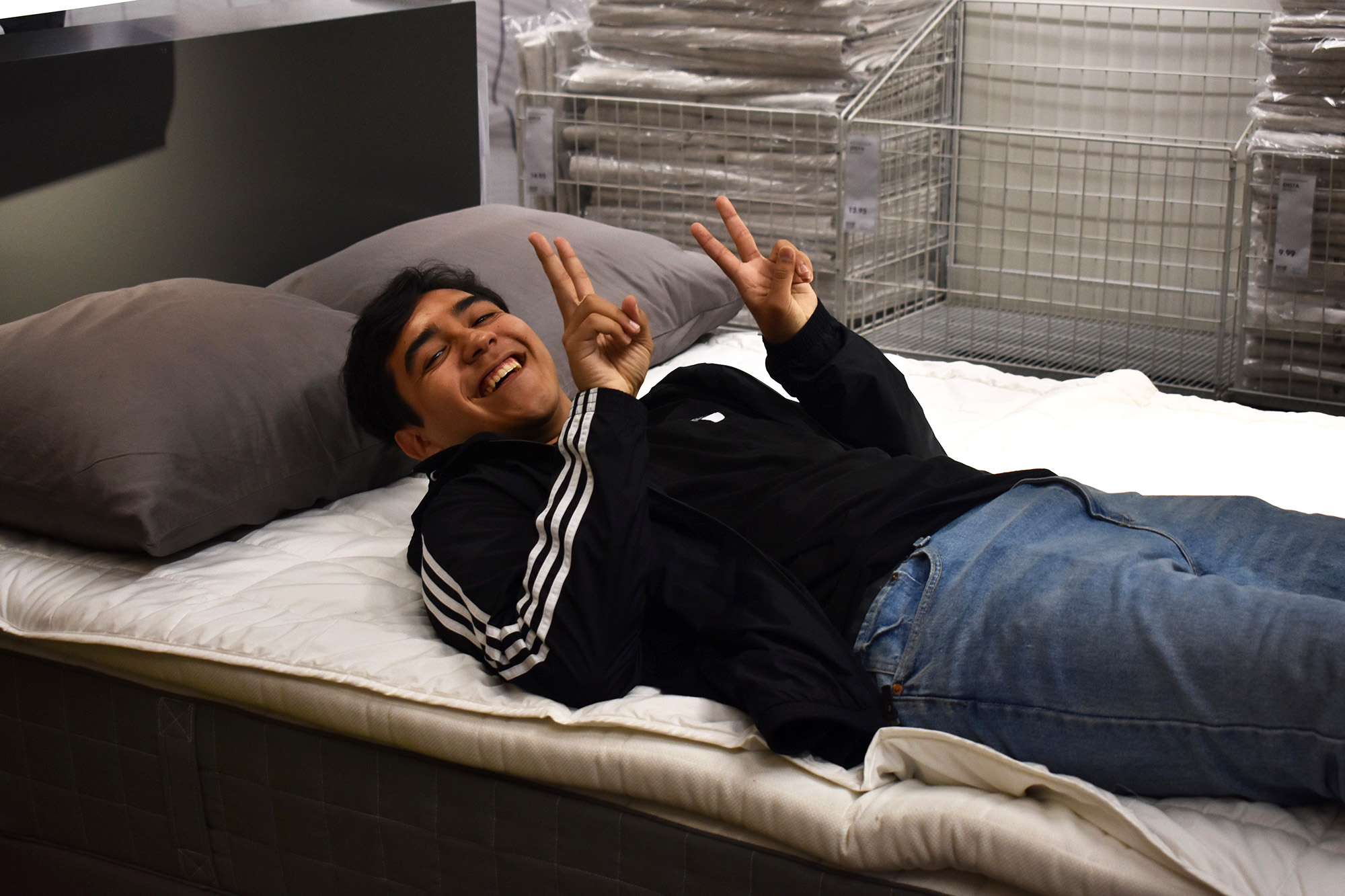 Na de lunch volgt de benedenverdieping van de winkel. Vooral op de keukenafdeling vult Oropeza zijn (inmiddels tweede) tas. Van vergiet Vispad tot snijmat Proppmätt: alles gaat mee naar het Hattagebouw. “Ik doe ook meteen aankopen voor onze gezamenlijke keuken, dus mijn huisgenoten betalen mee.” Maar dan moet het hoogtepunt van de dag nog komen. Want zodra de student in het zelfbedieningsmagazijn zijn nieuwe dekmatras uit het juiste schap haalt, verschijnt een glimlach op zijn gezicht die de hele middag niet meer verdwijnt. Via Snapchat stuurt hij een foto van zijn kar vol aankopen direct door naar familie en vrienden.