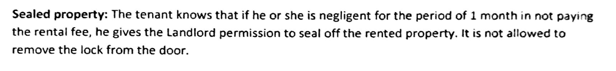 De huurder weet dat hij de huisbaas toestemming geeft om het gehuurde te verzegelen, als de huurder voor een periode van 1 maand de huur niet heeft betaald.