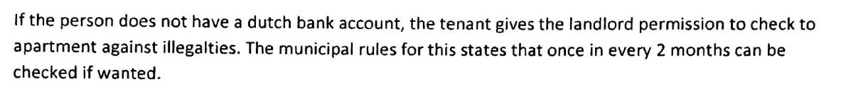 Als de huurder geen Nederlandse bankrekening heeft, geeft hij de huisbaas toestemming om het appartement elke twee maanden te controleren op illegale activiteiten.