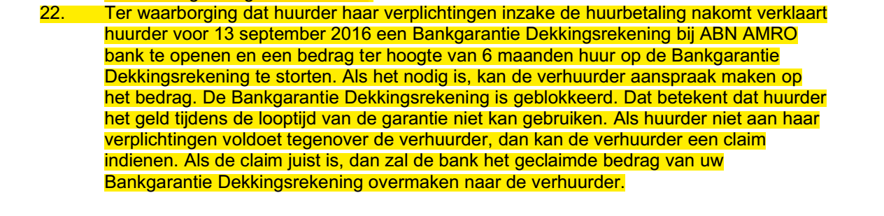 De huurder moet zes maanden huur op een Bankgarantie Dekkingsregeling van de ABN Amro vastzetten. Als het nodig is, maakt de verhuurder aanspraak op het bedrag.