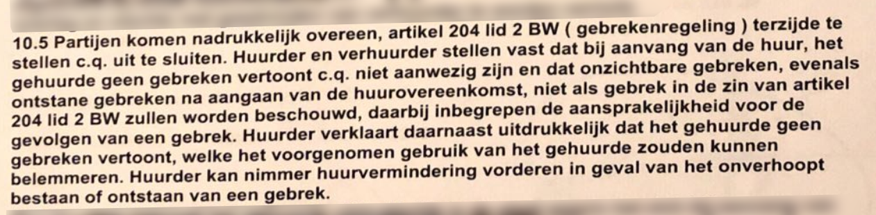 Partijen komen nadrukkelijk overeen artikel 204 lid BW (de gebrekenregeling) terzijde te stellen c.q. uit te sluiten.