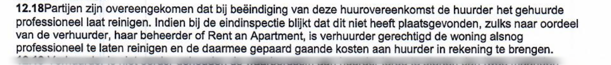 Partijen komen overeen dat bij beëindiging van de huurovereenkomst de huurder het gehuurde professioneel laat reinigen.