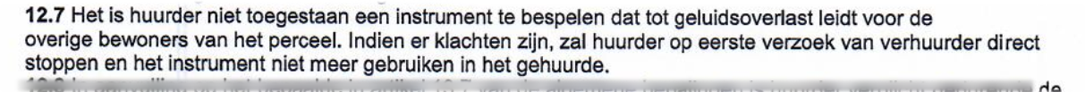Het is huurder niet toegestaan een instrument te bespelen dat tot geluidsoverlast leidt. (…) Indien er klachten zijn, zal huurder op eerste verzoek van de verhuurder direct stoppen en het instrument niet meer gebruiken in het gehuurde.