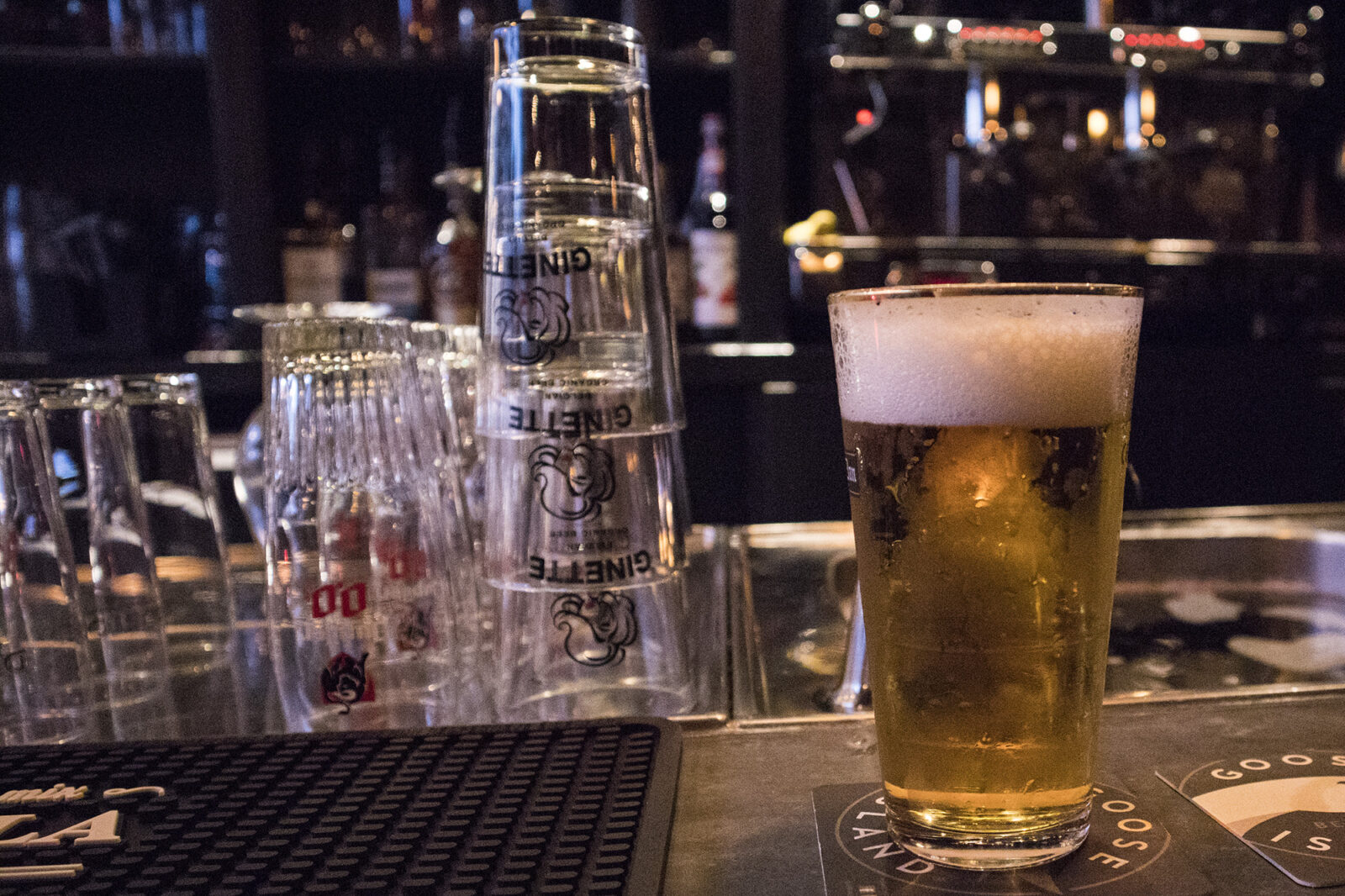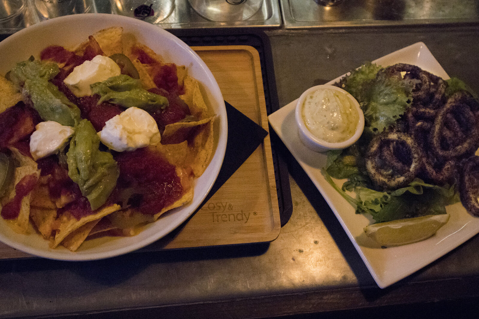 Het is rustig vandaag, aan drie tafels zitten mensen te eten en een paar jongeren hangen aan de bar. Er wordt flink gedronken, de halve liters gaan er goed in. De kaart is simpel: snacks als nacho’s en gefrituurde inktvisringen zijn goed op smaak en leggen een prima bodem voor het bier. Dat bier smaakt ook niet verkeerd trouwens en kost maar €2,90.