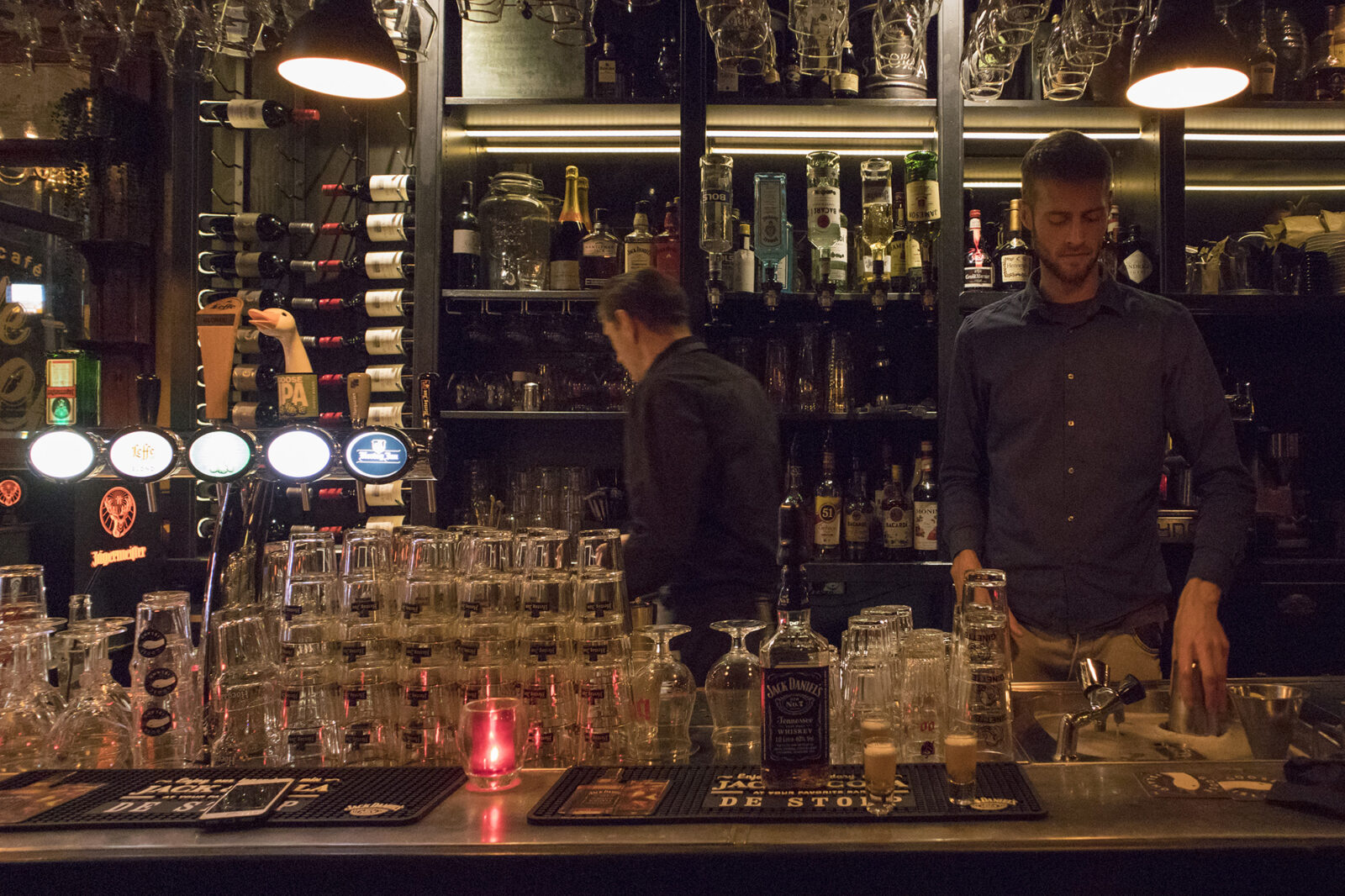 Jesse, de nieuwe eigenaar van de Stoep, maakt voor ons een welkomstdrankje. Een shot met Jack Daniels en iets zuurs, dat moet wel lekker zijn. De aankleding van het café is simpel: er staat een enkel plantje en kaarsje. Meer is ook niet nodig, deze kroeg ademt sfeer. De leren banken en stoelen, glas-in-loodramen en koperen bar geven de Stoep de uitstraling van een echt bruin café.