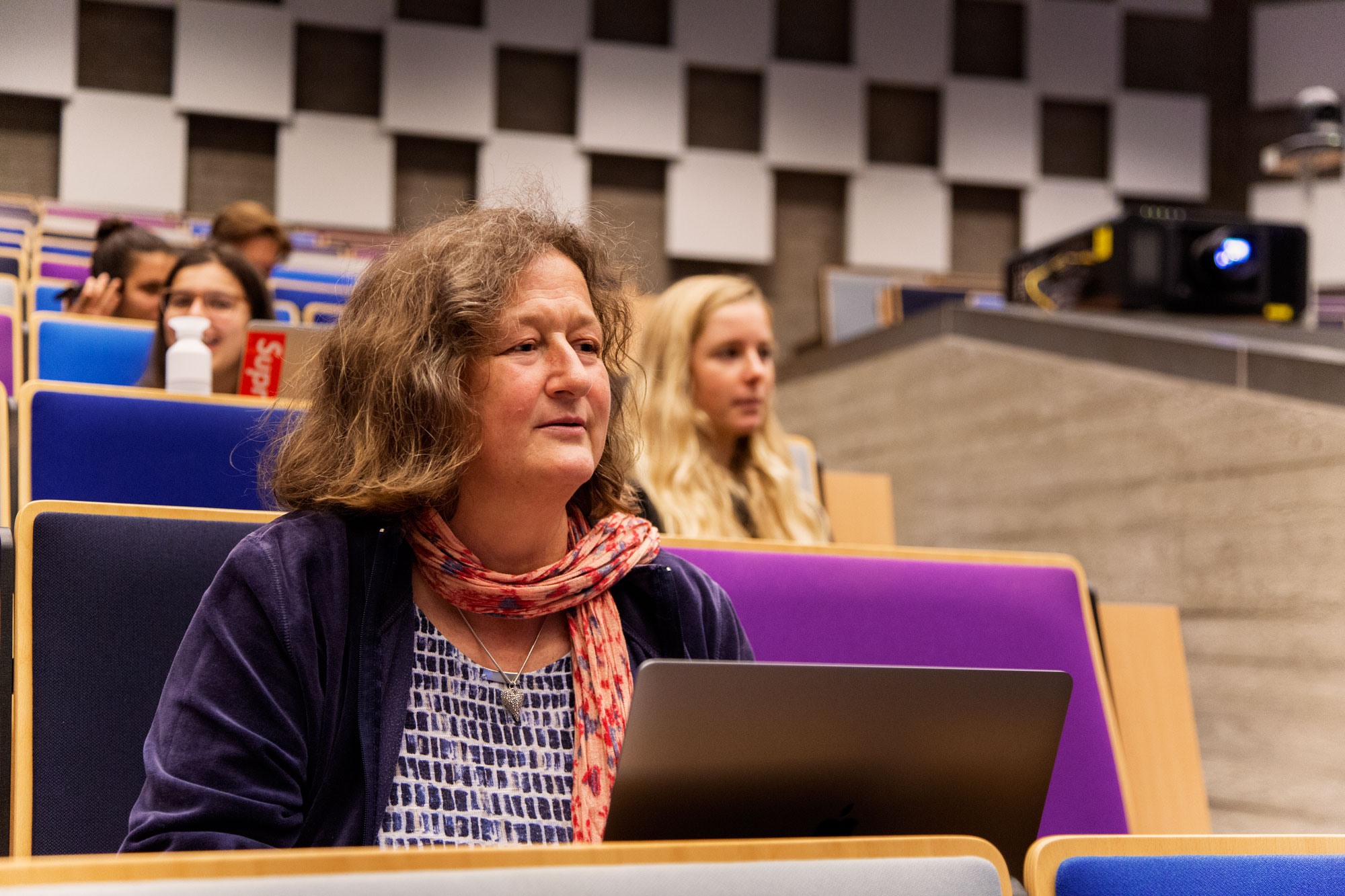 Terwijl de andere studenten binnendruppelen, zit Annemarie de Graaf (54) er al klaar voor. Voordat het college begint, praat ze met haar medestudenten, met name over de aankomende tentamens. Tijdens het college, History of Western Art and Culture, zit ze echter liever alleen.