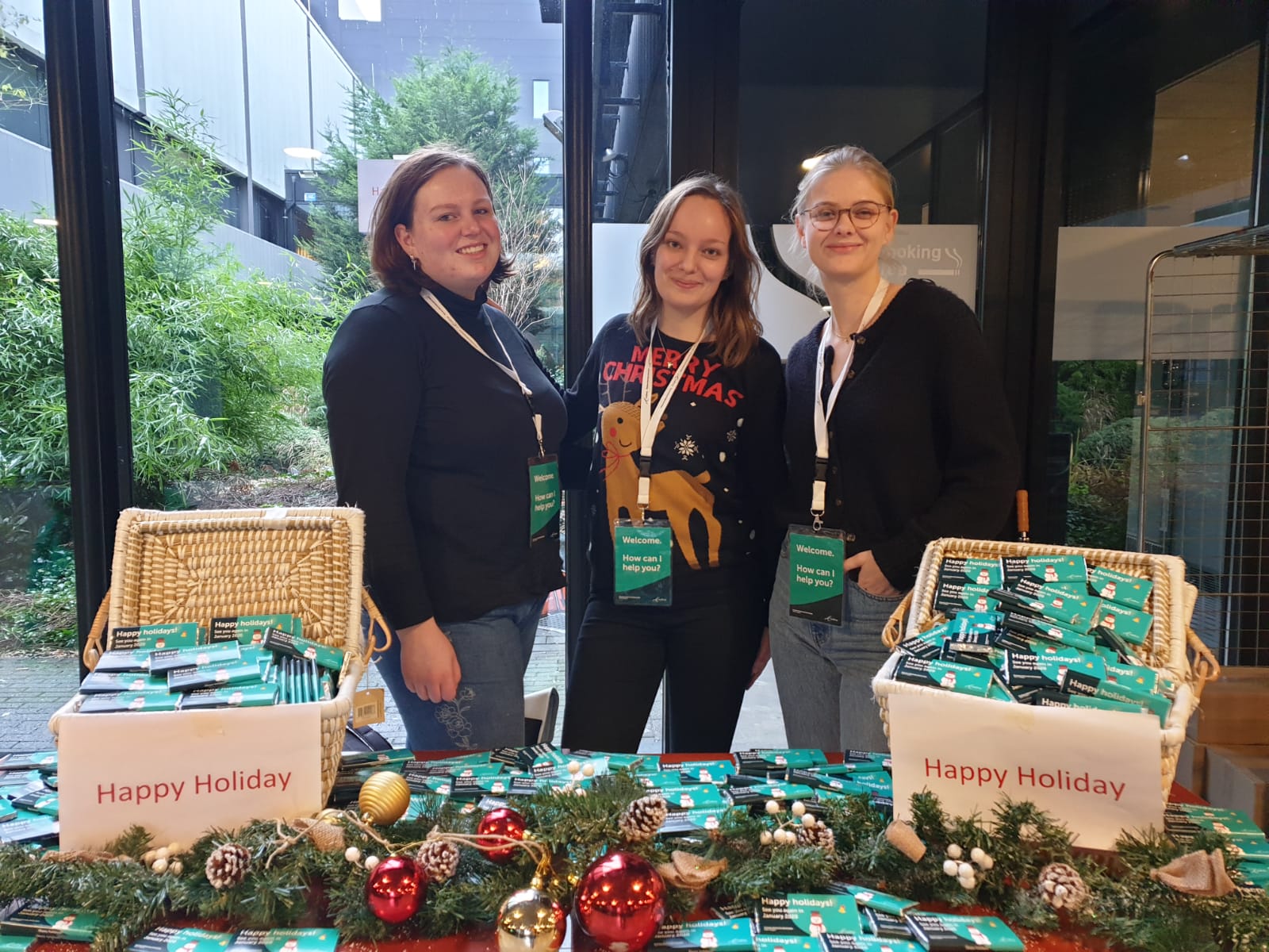 Studenten Nienke, Emma en Brechtje staan bij de ingang van de tentamenzalen. Ze zijn ingehuurd door de EUR om studenten te begeleiden naar de zaal. “Sommige studenten, vooral internationals, zijn hier nog nooit geweest”, vertelt Nienke. “Dus we willen er graag voor zorgen dat ze niet in een verkeerde zaal terechtkomen.” Gelukkig was van stress nauwelijks iets te merken, zag Nienke vanochtend. “De studenten zagen er heel relaxt uit”, lacht ze. “Er zit een supermarkt tegenover Ahoy en zeker een op de tien studenten haalde even een kaasbroodje voordat ze naar binnen gingen.”