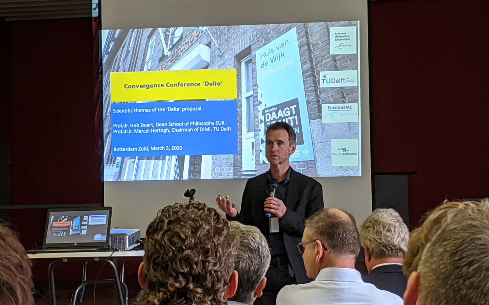Academisch leider van de Delta en decaan van de Erasmus School of Philosophy Hub Zwart vertelt na afloop van een congres in een buurthuis in Rotterdam-Zuid over het nieuwe onderzoeksthema en over de kansen voor de wetenschap als er meer wordt samengewerkt.