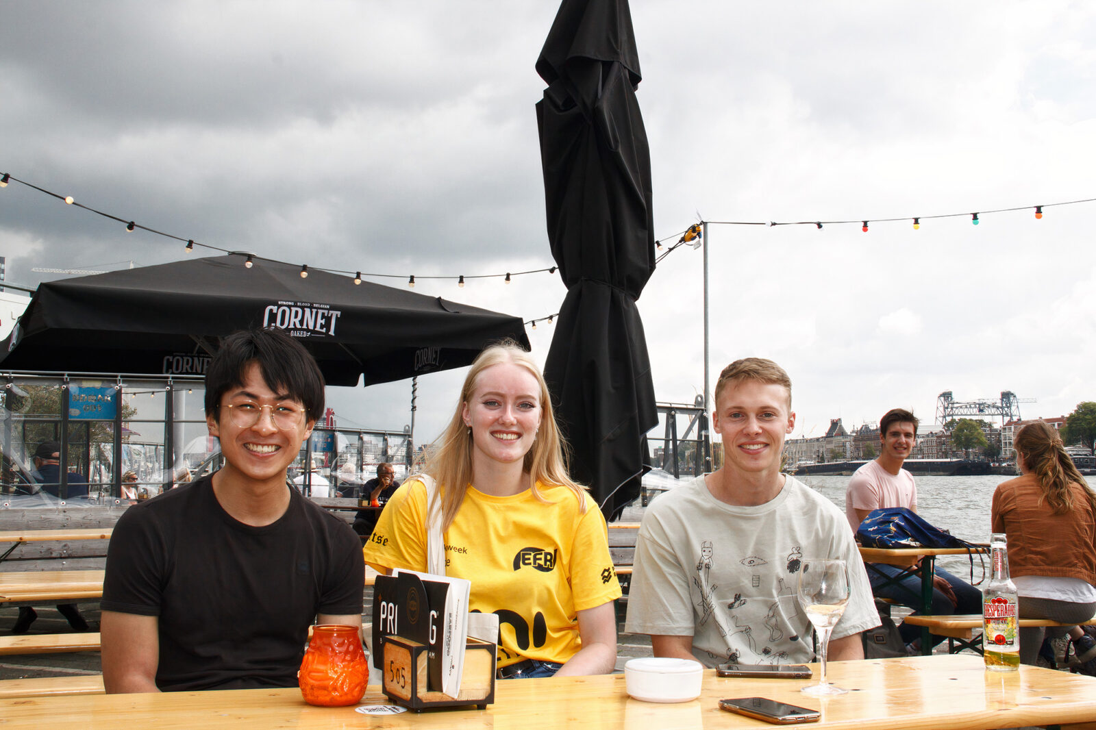 Het spel bestaat uit twee onderdelen, een deel online en een deel in de stad. Onderaan de Erasmusbrug zitten Yi Min en Quinten, twee aankomende studenten Economie en Bedrijfseconomie. Het online gedeelte van het spel hebben ze al achter de rug. “Op maandagavond hebben we via Zoom een groepsnaam en logo bedacht en een groepsfoto gemaakt,” zegt Yi Min, aankomend student Economie en Bedrijfseconomie. “In het begin van de online meeting was het erg ongemakkelijk. Iedereen wacht maar af tot een ander iets gaat zeggen.” Quinten begrijpt die ongemakkelijkheid wel. “Je weet dat iedereen het spannend vindt, maar gelukkig is er altijd wel een iemand die zicht opoffert om de stilte te doorbreken.”