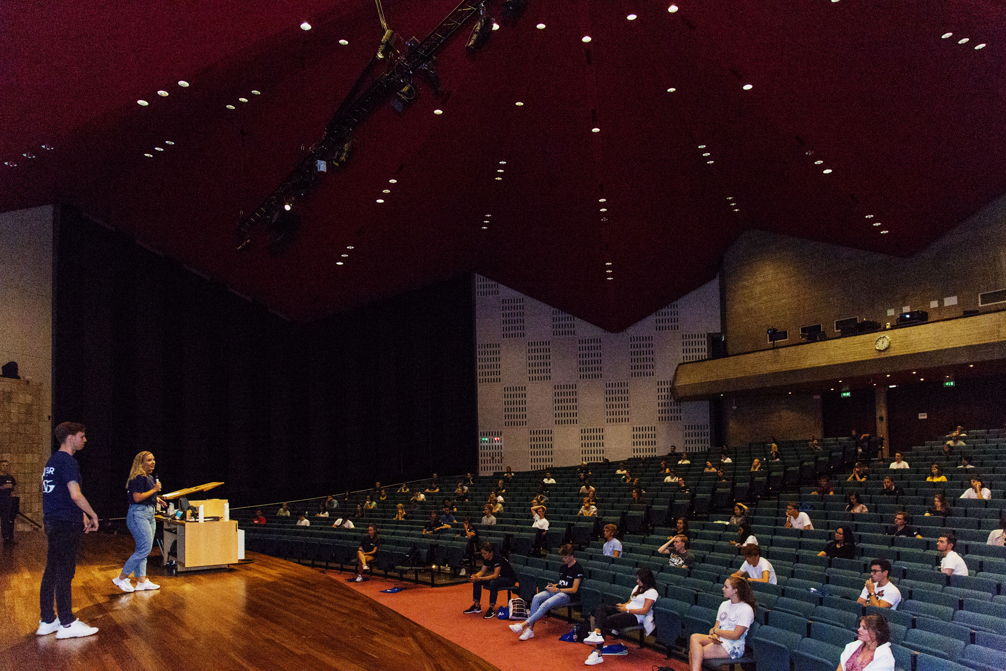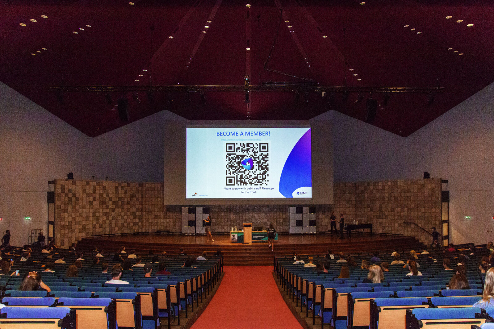 Er komen nog steeds studenten de aula binnenlopen wanneer Tom van Gogh, vicevoorzitter en programmamanager, de bijeenkomst opent met een veelbelovende uitspraak: “Bij STAR geven we je de kans te leren, te groeien en uit te blinken.” Hij vraagt alle studenten om hun telefoon te pakken en deel te nemen aan de Kahoot-quiz. Je kunt niet als smoesje gebruiken dat je geen wifi hebt, want je kunt ‘96EUR’ sms’en naar een speciaal telefoonnummer om het wachtwoord op te vragen.
