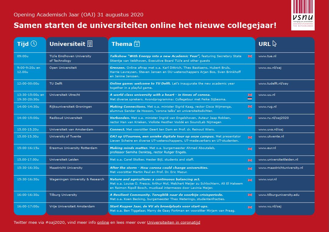 Gelukkig kan er digitaal een heleboel, aldus universiteitenvereniging VSNU. De veertien universiteiten slaan dit jaar de handen ineen en houden op maandag 31 augustus een online openingsfestival, compleet met blokkenschema van de line-up. Vanzelfsprekend zal er veel worden stilgestaan bij de impact van de coronacrisis.