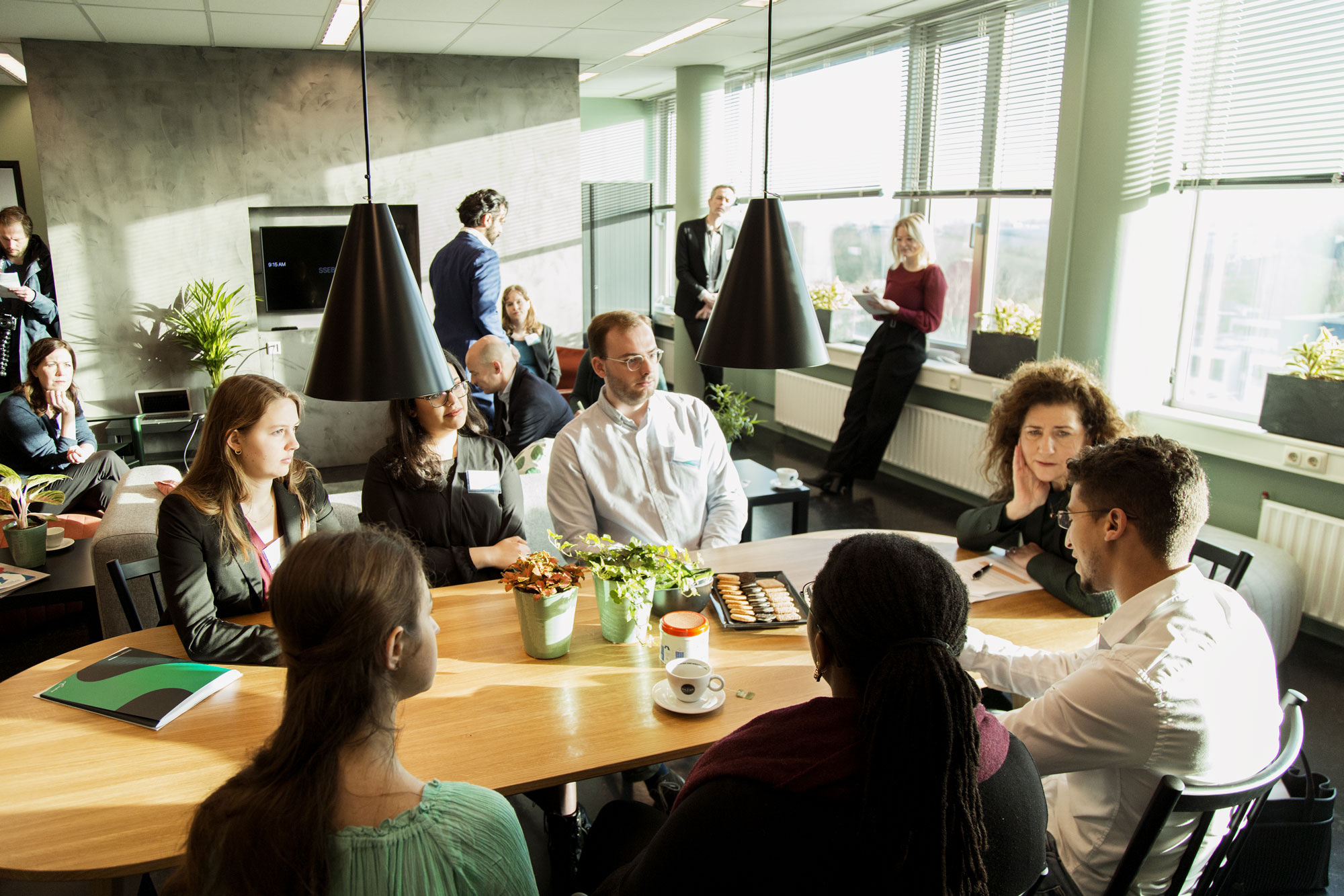 Onderwijsminister Ingrid van Engelshoven in gesprek met studenten tijdens een bezoek aan de Erasmus Universiteit
