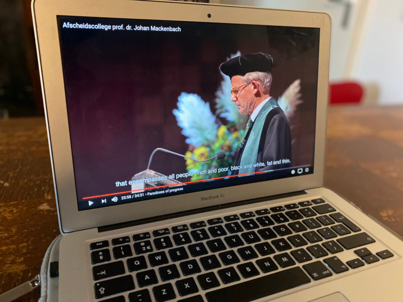 Dus stond Mackenbach vorige week vrijdag voor een lege zaal te praten. Maar het mooie eraan was dat er veel meer mensen gemakkelijk mee konden kijken online, dan bij een offline afscheidscollege. “Normaal gesproken, als je een beetje wordt gewaardeerd, komen er een paar honderd mensen naar je afscheidscollege.” Zijn afscheidscollege, dat van tevoren opgenomen was, werd vrijdagmiddag uitgezonden en live keken zo’n negenhonderd mensen mee. Dat is het voordeel van online.