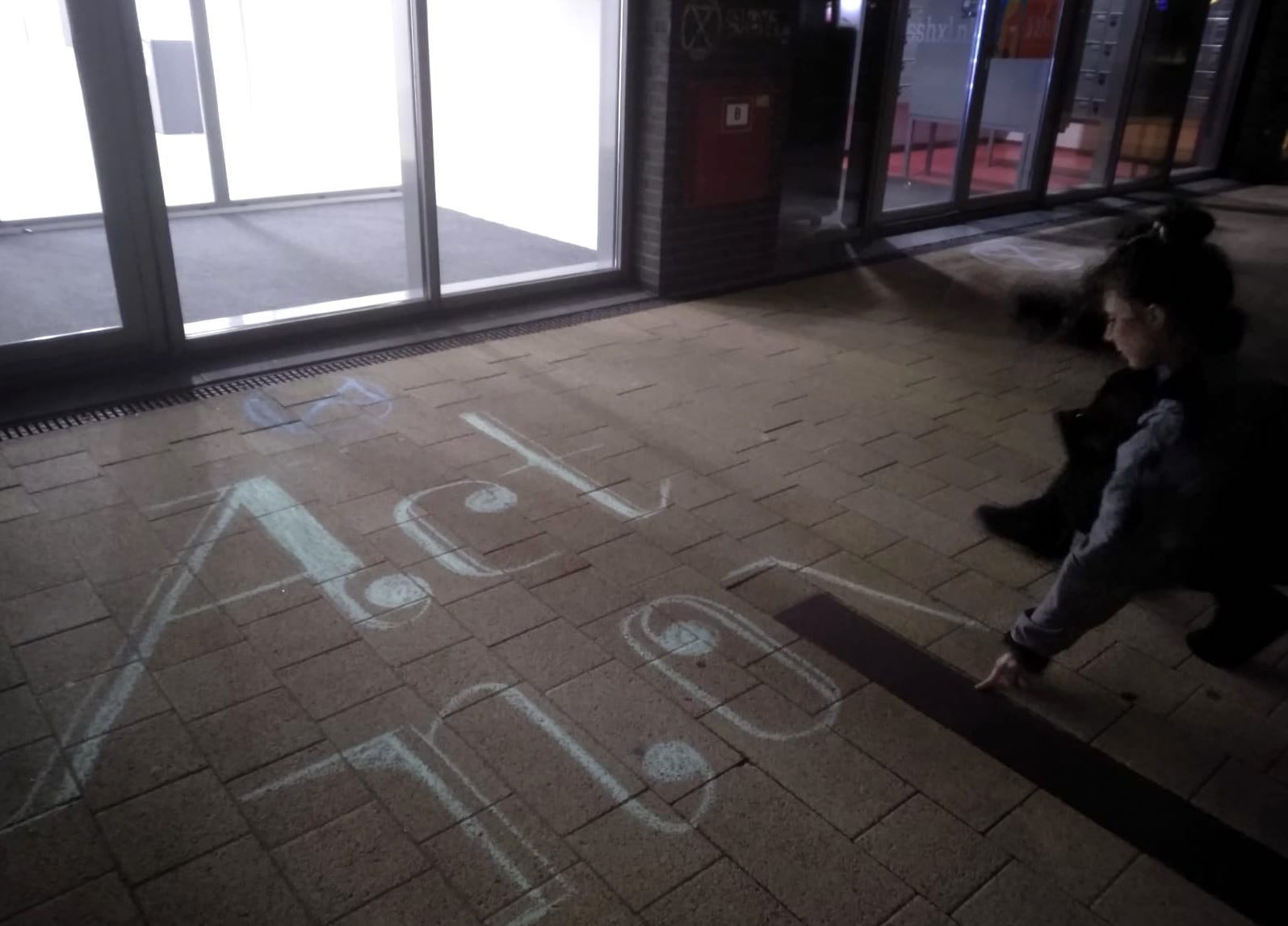 Als de studenten het spandoek uitrollen bij het beeld van Erasmus naast de aula, zijn er meer bewakers dan protesterende studenten. Want ja, corona, en dus konden niet alle dertig leden aanwezig zijn. Vier demonstranten wilden flyers uitdelen, maar dat mocht ook niet vanwege de pandemie. De boodschap in stoepkrijt op de campus is onleesbaar geworden door de regen. ‘Act now’ stond onder meer voor de ingang van de UB. Het maakt de studenten weinig uit, zolang de universiteit maar actie gaat ondernemen.