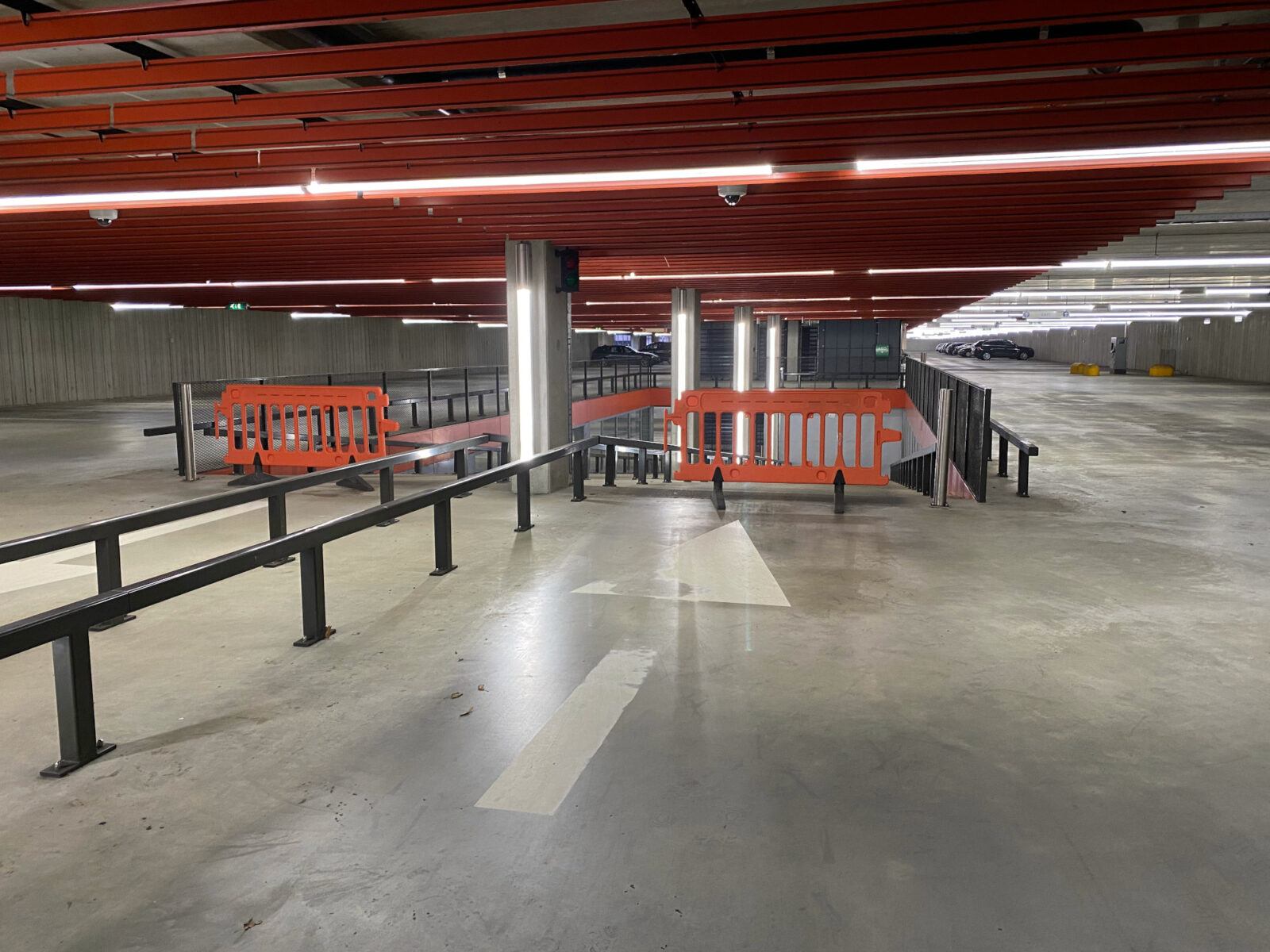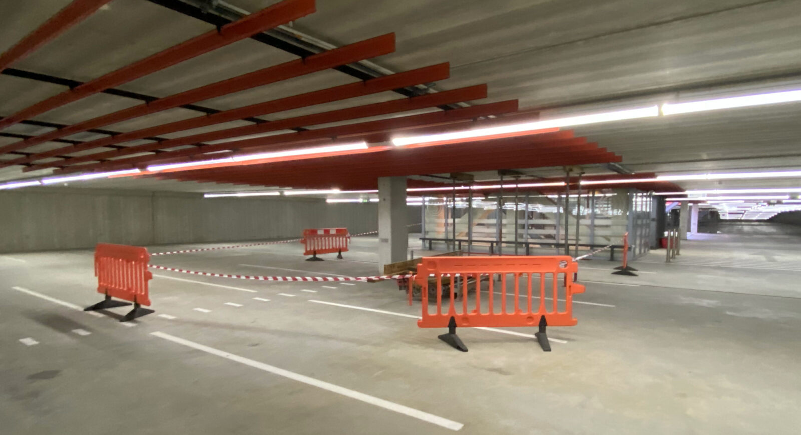 De parkeerplaatsen direct onder de scheur zijn afgezet met rood-wit lint en hekken. De scheur zelf is gestut met aluminium palen en hout. Op de verdieping boven de scheur is niets te zien aan de vloer. Wel is de plek daar ook afgesloten met lint. Voor de auto-ingang van de parkeerplaats hangt rood-wit lint en sommige voetgangersingangen zijn ook afgesloten, maar niet alle.