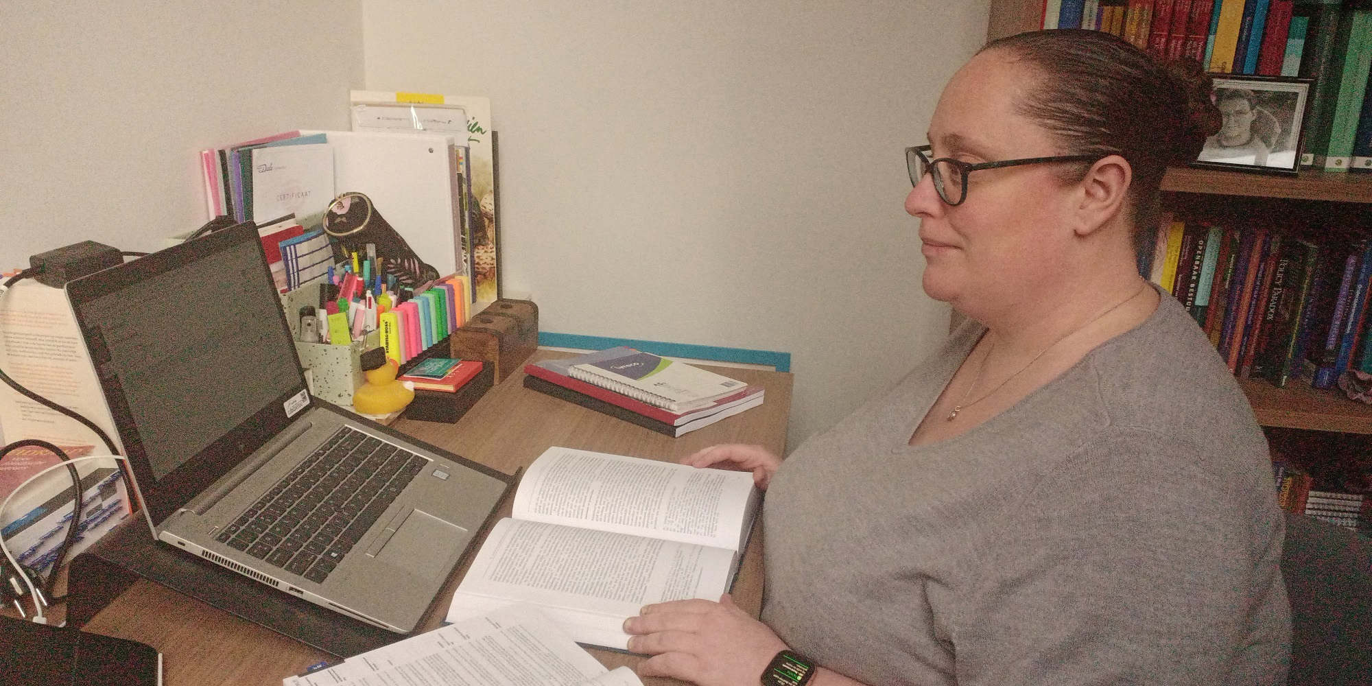 “Toen de crisis uitbrak, werd er snel besloten dat de bijeenkomsten van mijn vak Juridisch-academische vaardigheden niet door gingen. Toen hebben we de colleges heel snel omgebouwd met webcasts en extra opdrachten zodat studenten toch onderwijs konden krijgen. Vanaf juni vorig jaar ben ik daarnaast onderwijsgroepen gaan begeleiden.