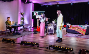 Het evenement, een initiatief van het Programma Studentenwelzijn van de EUR in samenwerking met Siggie Online Coaching, vindt deels fysiek plaats in een theaterzaal, die is ingericht als de woonkamer van een studentenhuis: er staat een slaapbank, een tafel met een laptop en een bijzettafel met een paar lege blikjes cola erop. Aan de muur hangt een groot scherm waarop de deelnemers te zien zijn in een zoom-meeting: studenten, docenten en anderen die het optreden live volgen.