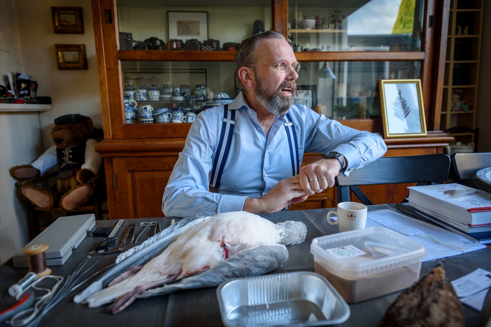 Klinisch ethicus Erwin Kompanje prepareert verongelukte meeuwen in de woonkamer