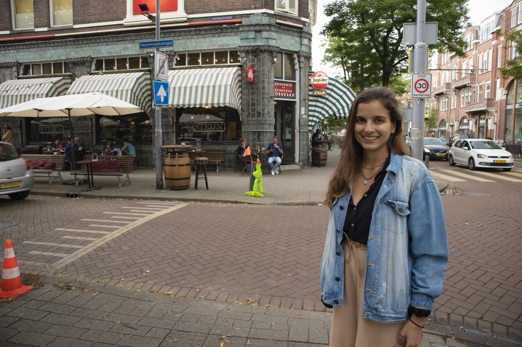 Na de koffie vertelt Maayke, wandelend door de Lusthofstraat, hoe het tijdens het afgelopen coronajaar was om in Kralingen te wonen. Was het met een gesloten universiteit, sociëteit en kroegjes nog wel zo leuk? “Het was natuurlijk even anders, maar vanwege mijn tussenjaar had ik niet de struggles van het online studeren die ik bij mijn huisgenoten zag. Ook het sociaal isolement viel mee: veel vrienden wonen in de wijk, dus kwam ik continu bekenden tegen. Vooral in de Albert Heijn hier, die werd een soort vaste ontmoetingsplek. Iedereen was non-stop boodschappen aan het doen! Soms kwam je wel drie keer per dag dezelfde mensen tegen, omdat je iets was vergeten of je je gewoon verveelde.”
