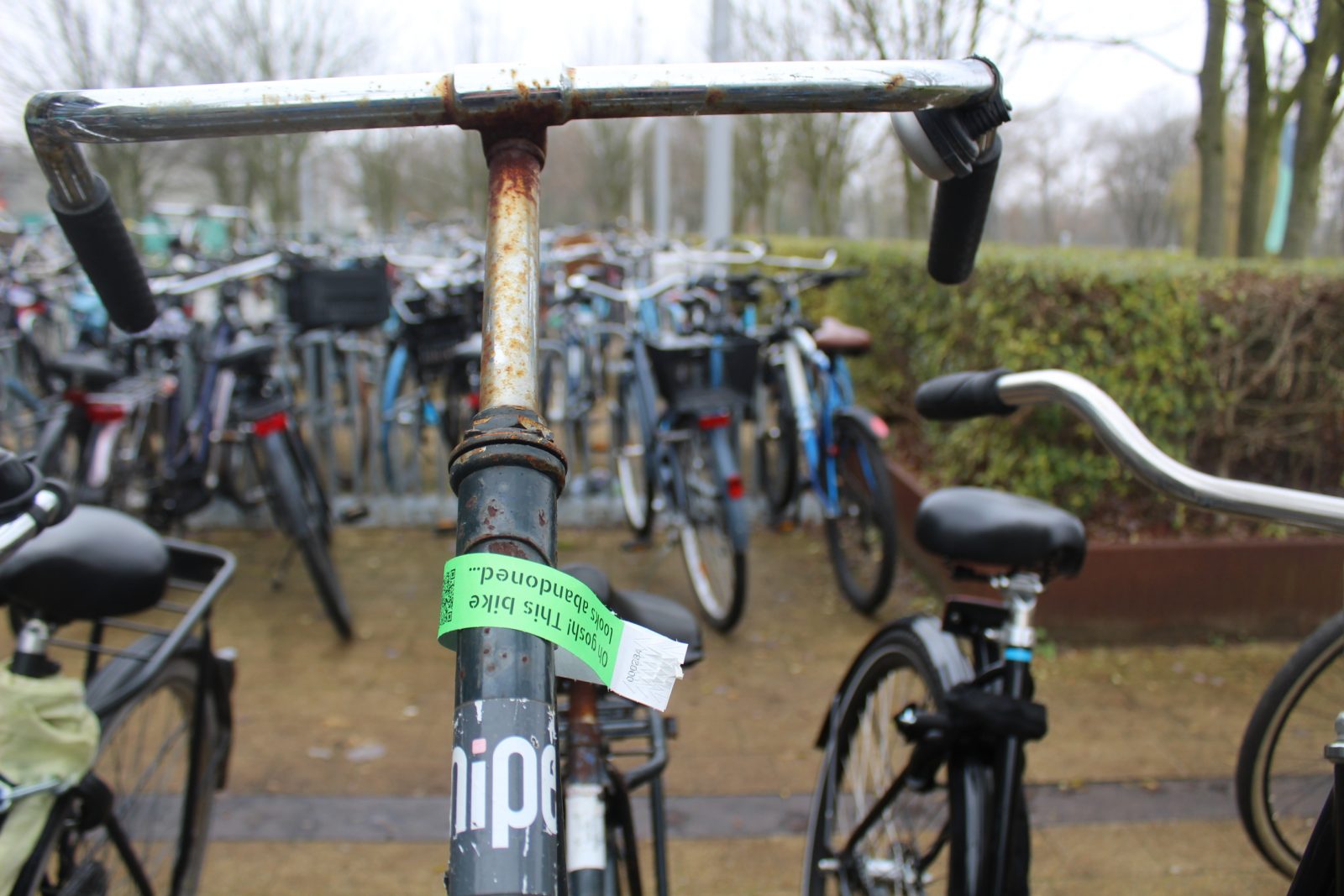 In de fietsenrekken voor het Polakgebouw staan maandag 21 fietsen met een groen label tussen de andere fietsen geparkeerd. Op het label staat de tekst: “Oh gosh! This bike looks abandoned”, naast een QR-code.
