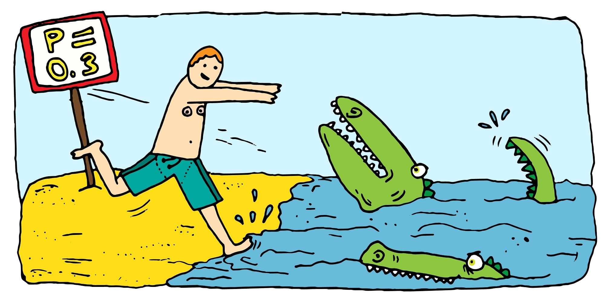Tijdens de berekening moet je goed kijken of het om een conditionele kans gaat. Dat betekent dat de kans dat A gebeurt, afhangt van gebeurtenis B. “Wat is de kans dat je dood bent als een haai je kop eraf bijt?”, vraagt de docent. “Dat is natuurlijk honderd procent. Dit is een conditionele kans. A (dood) gebeurt als B (je kop eraf door een haai) plaats heeft gevonden. Maar omgekeerd: hoe groot is de kans dat een haai je kop eraf bijt als je dood bent? De kans daarvoor is bijna nul, want A (dood) heeft meestal niks te maken met B (bijtende haai). Hier is dus geen sprake van een conditionele kans.”