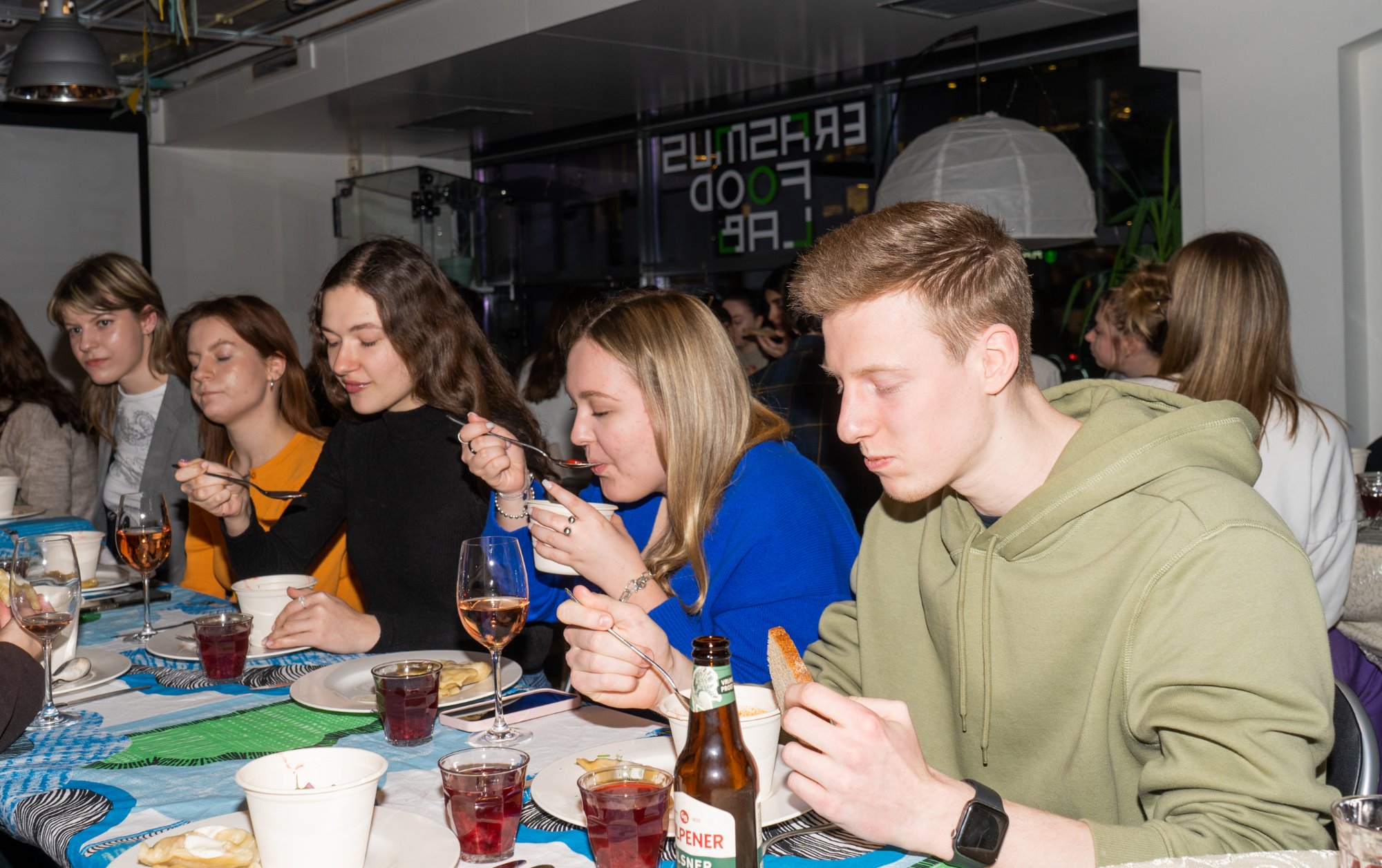 Het hele Erasmus Food Lab stond woensdag in het teken van Oekraïne. Naast een hoop vrijwilligers waren er zo’n vijftig studenten die zich hadden aangemeld om deze avond Oekraïense gerechten te eten en geld te doneren aan de goede doelen Come Back Alive en Nova Ukraine. Uiteindelijk is er meer dan tweeduizend euro opgehaald.