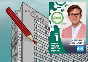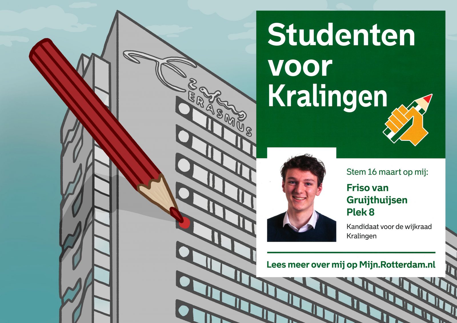 Er zijn 23 kandidaten voor de wijkraad Kralingen en maar negen plekken. Van Gruijthuijsen moet dan ook vol aan de bak tot 16 maart, maar dat doet hij met veel plezier. “Posters ophangen, flyeren op de campus. Ik zit momenteel niet veel aan de studie.”