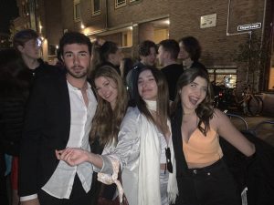 Aan het begin van de avond waren Nicky Hoekstra en Seyeon Kim al helemaal in de oranjestemming, met oranje topjes en cowboyhoeden. Hoewel Nicky half Nederlands is, wist haar vriendin Seyeon nog niet veel over Koningsdag. Zij is eerstejaars student Arts & Culture, dus dit was pas de eerste keer dat ze het vierde. “Ik had niet verwacht dat iedereen oranje zou dragen, maar ik vind het geweldig hoe ze dat allemaal doen. Zo’n Nederlandse spirit, ik vind het geweldig”, zei Seyeon.  “Ik kom uit Zuid-Korea en daar heb ik nog nooit gezien dat iedereen dezelfde kleur draagt voor een feestdag of iets dergelijks.”