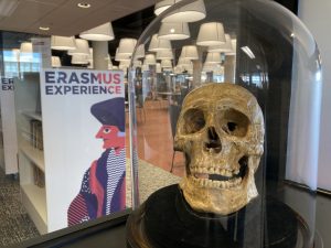 De schedel van Erasmus nodigt de onderzoekers uit, in de bezoekersruimte van de Erasmuscollectie van de Bibliotheek Rotterdam. Erasmus had een klein hoofd, wat vreemd lijkt voor zo’n grote denker.