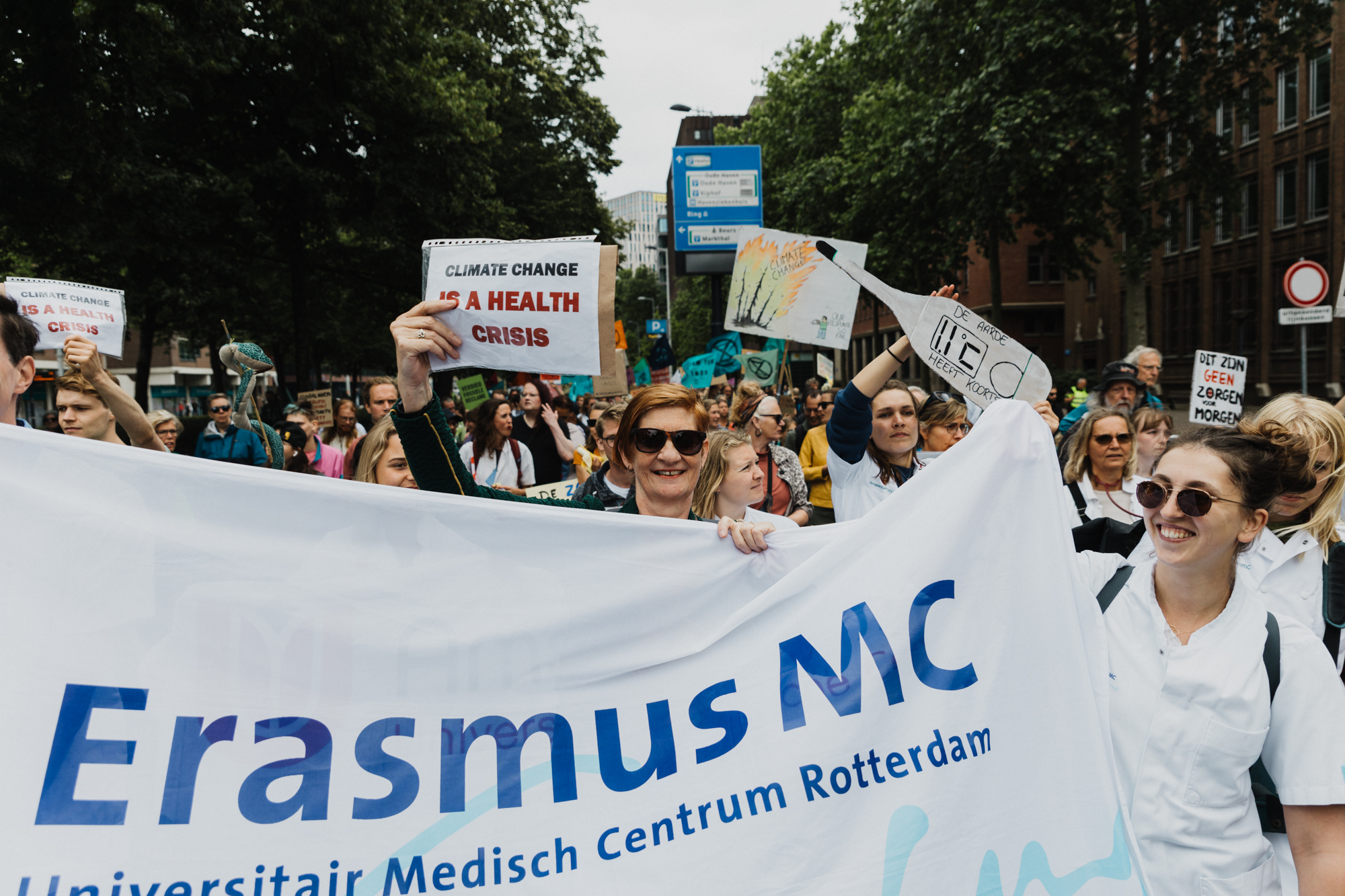 Laatstejaars geneeskundestudent Juliette Mattijsen is een van hen. Ze zet zich bij het Erasmus MC in voor onderwijs over de relatie tussen klimaat en gezondheid. “Klimaatverandering lijkt soms ver weg, maar het gaat over jou, over mij, over je naasten: door klimaatverandering worden mensen ziek. Ik hoop dat dat tastbaarder wordt door dit protest. We moeten gezondheid integraal meenemen in het klimaatbeleid.”