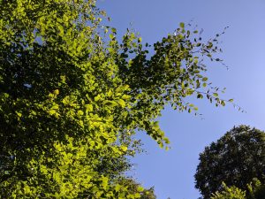 Het kan soms best druk zijn in Amelisweerd, maar deze maandagmiddag is het bos grotendeels verlaten. Overdag was het bewolkt, maar nu is de lucht opengetrokken en de groene blaadjes fluoresceren in de namiddagzon. Op de grond ligt een eerste onrijpe kastanje en verderop gaan de kuikens van een eend te water in de Kromme Rijn. Rondom de Pepernotenberg is het bijna donker, zó dicht is het bos in deze tijd van het jaar. Vervolgens breekt het bij restaurant De Veldkeuken open in een statig trapeziumbos (de naam duidt op het patroon van de paden) van monumentale bomen. Helaas is De Veldkeuken gesloten op maandag, dus geen koffie voor mij. Ik loop door over het jaagpad langs de Kromme Rijn richting Theehuis Rhijnauwen.