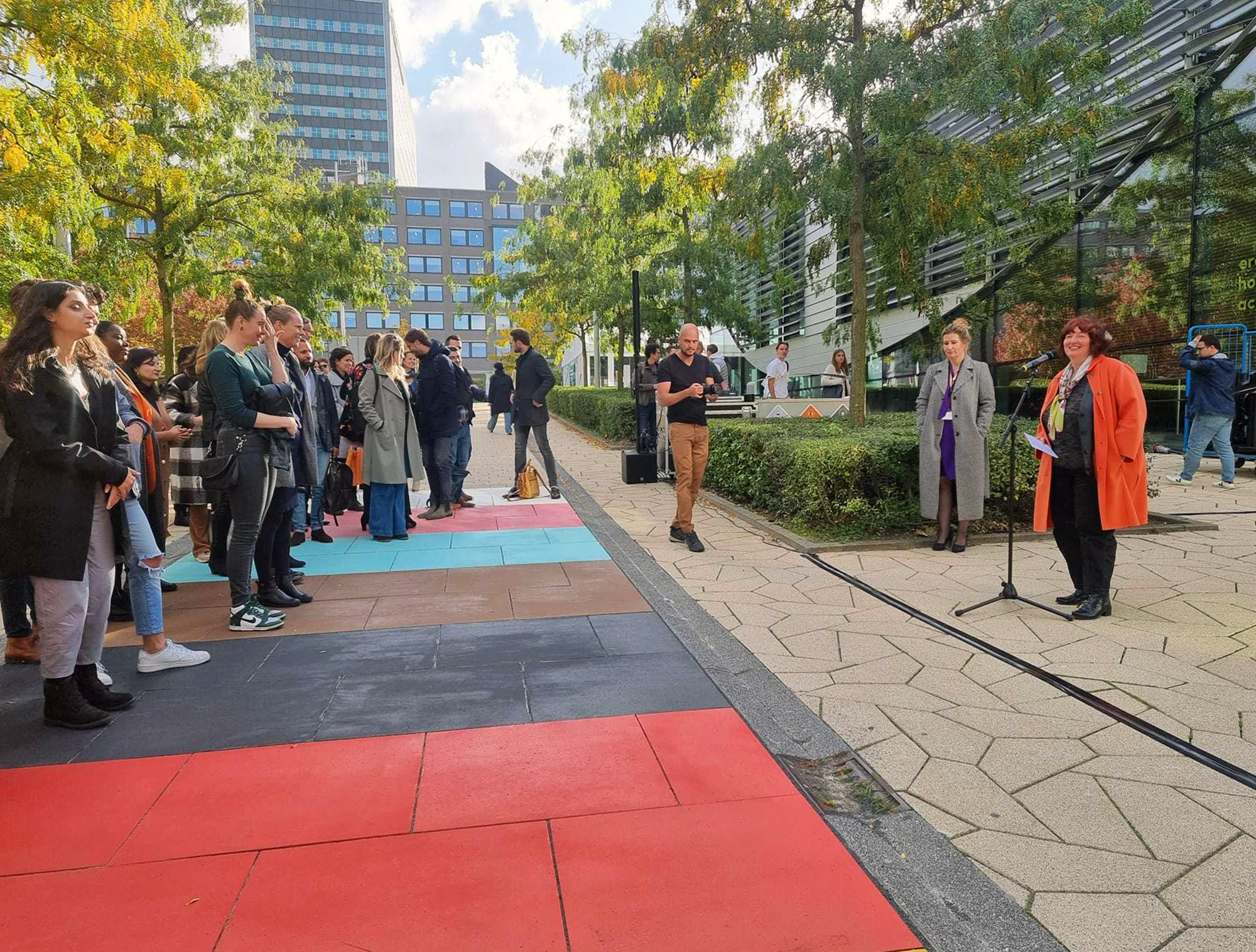 Ruim veertig mensen bezochten de ‘openingsceremonie’ op de Institutenlaan.  Van Schoten opende het feestje met een korte toespraak waarin ze ook aankondigde dat studenten vanaf nu hun voornaamwoorden kunnen aanpassen in Canvas. Semiha Denktaş van het Diversity & Inclusion Office nam daarna de microfoon over: “Dit pad ziet er niet alleen mooi uit, het staat ook symbool voor verbinding en acceptatie in onze gemeenschap.”