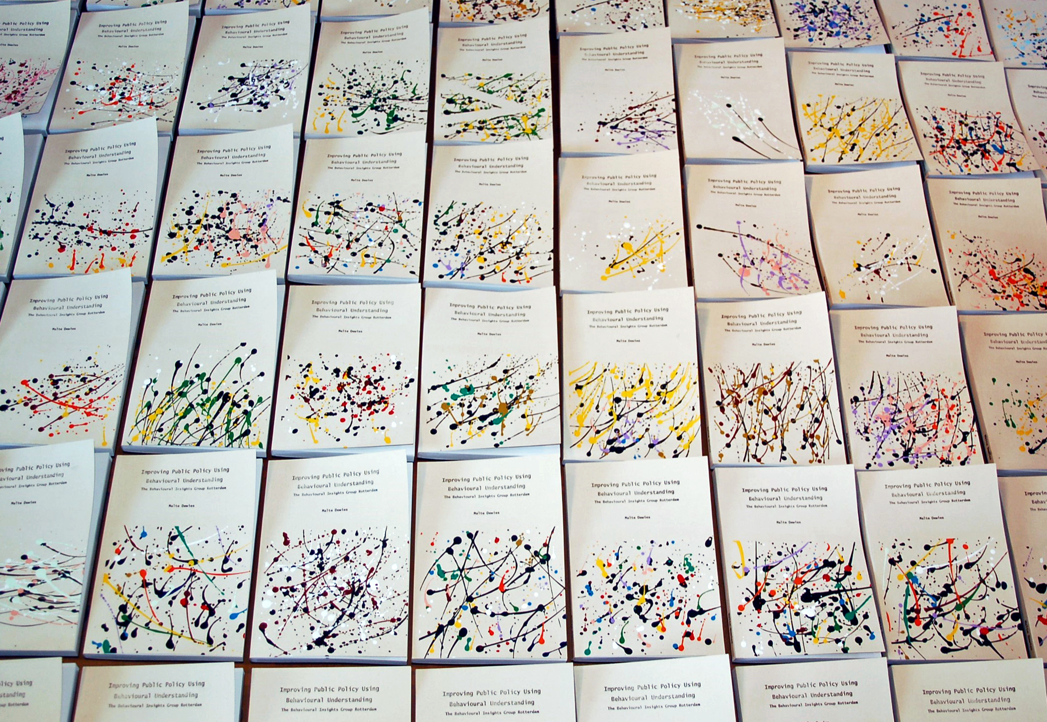 “Ik heb voor iedereen aan wie ik een boek heb gegeven, een handgeschreven bedankje geschreven. Omdat ik weet dat dit boek nooit in de boekhandel zal komen te staan, vond ik het niet zo belangrijk dat het er professioneel uit zou zien. Ik wilde er een cadeautje van maken voor vrienden en collega’s, door het te personaliseren. Anders is het niet echt een cadeau. Helaas kan ik niet tekenen, dat zou er belachelijk uitzien. Dus wilde ik er, geïnspireerd door de schilder Jackson Pollock, een mozaïek van verfspatten op aanbrengen. Maar omdat dat praktische problemen gaf, heb ik ze allemaal apart met verf bespat.”