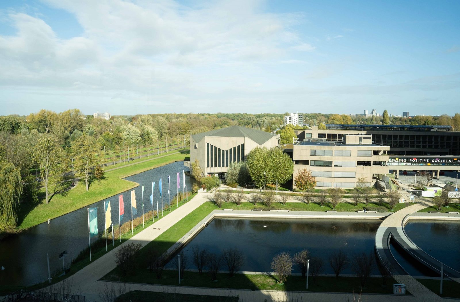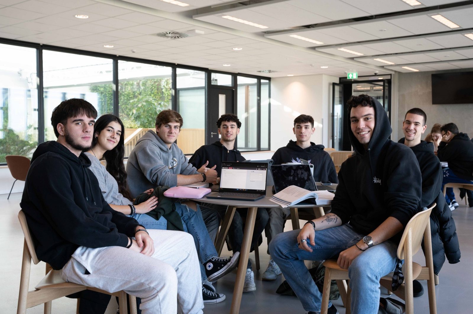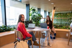 Op de tweede verdieping werken studenten Yasmina Wacher en Nefeli Poulipoulou geconcentreerd op hun laptop. De zon schijnt door het raam naast ze, dat uitkijkt op de Plaza en de vijver. Beiden keken wekenlang ernaar uit om in dit gebouw te studeren. “Toen de universiteit de opening van het gebouw aankondigde op sociale media, tagde ik Yasmina met een bericht: ‘We moeten echt hiernaartoe!’”, vertelt Nefeli.