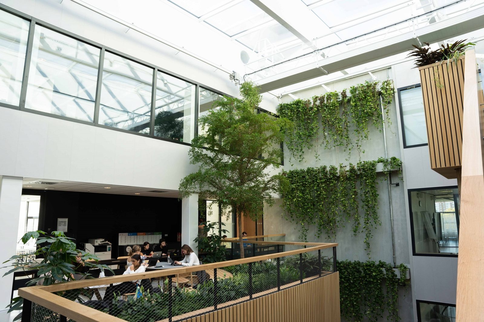 Wanneer je het Langeveldgebouw binnenkomt, oogt het groen en natuurlijk. De trap kronkelt in het midden van de ruimte, naast meterslange boomstammen, die functioneren als pilaren. Rondom een vierkant ‘tuintje’ op de begane grond waar een boom staat, zijn zitplekken en tafels. Rijen weelderige drakenklimop versieren de muren als een groene waterval.