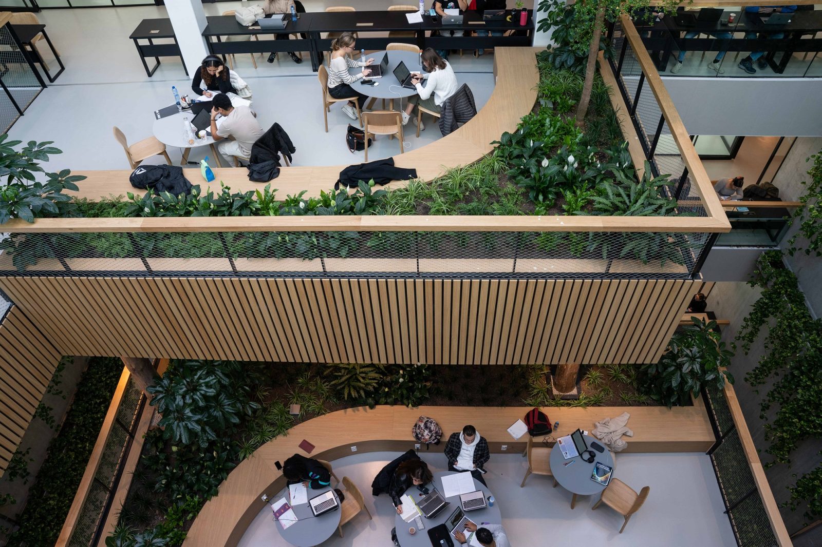 Op een traptrede op de eerste verdieping staat een student een selfie te maken. Naast haar maakt een andere student foto’s van de begane grond. Ze zijn niet de enige die hun ogen uitkijken, ook Miguel Pinto, eerstejaars International Business Administration, bewondert het gebouw van binnen. “Het is briljant ontworpen”, zegt hij enthousiast. “De combinatie van functionaliteit en schoonheid is verbazingwekkend. Door de houten look, de bomen en de planten waan je je in een waanzinnige boomhut.”