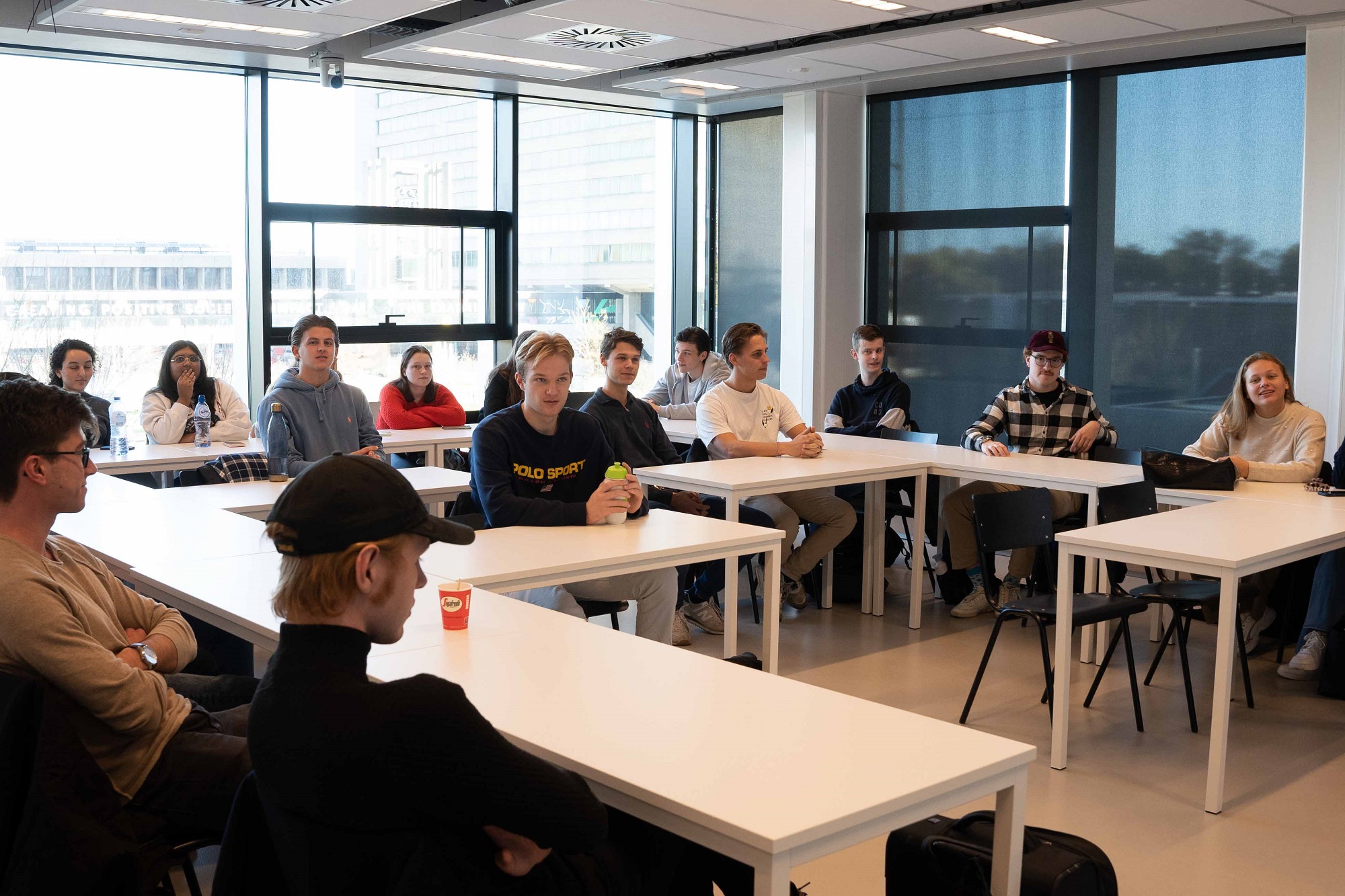In kamer 1.12 volgen tweedejaars bedrijfskundestudenten het college Professionele Ontwikkeling. Docent Floris de Lange vindt het een mooi gebouw met veel licht. “En het belangrijkste: alles werkt! Het geluid is goed in de zaal, het galmt niet. Met de techniek heb ik ook geen enkel probleem gehad”, vertelt hij. “Tijdens het college liepen bouwvakkers buiten af en toe langs het raam, dat is ook geinig om te zien.”