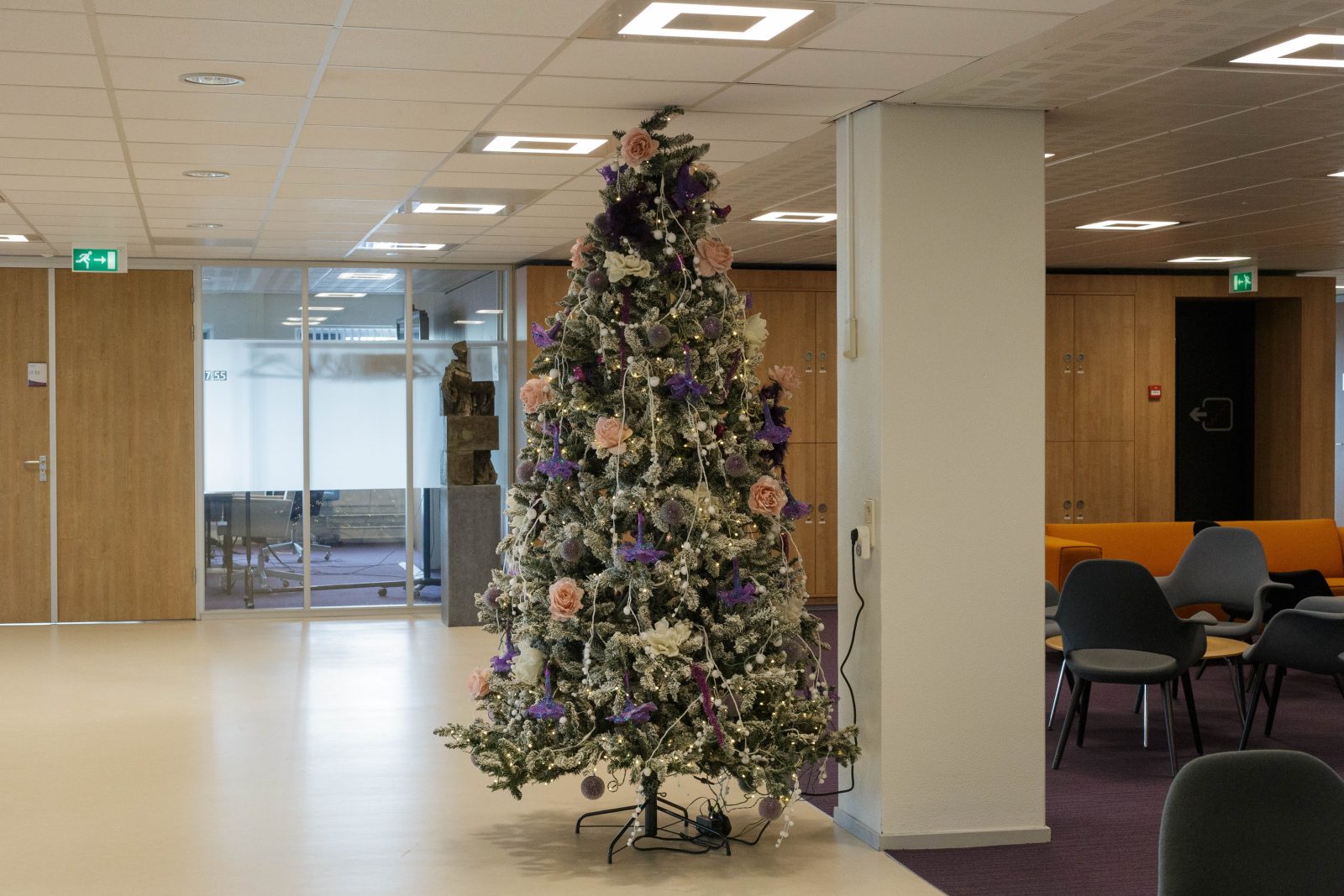 Nog maar amper een week te gaan tot de kerstvakantie, en de feestdagen staan voor de deur. Campus Woudestein is de afgelopen dagen feestelijk aangekleed. Daarom zijn we de campus rondgegaan op zoek naar de verschillende kerstversieringen op de universiteit. Van een raar afgezaagde boom in het Polak tot de meest spraakmakende boom op de zevende verdieping van het Bayle-gebouw.