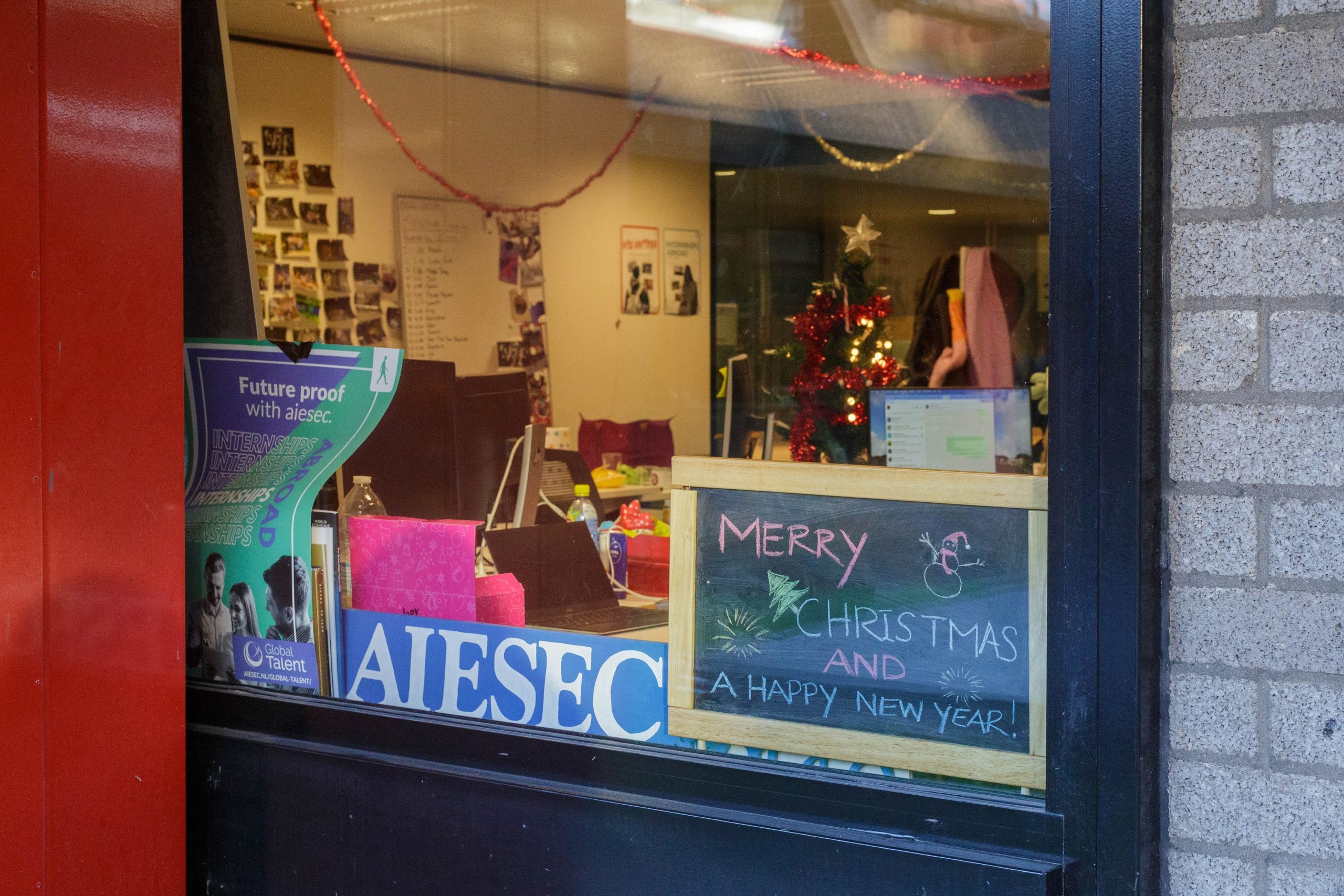 Onze trip begint ietwat teleurstellend, maar uiteindelijk vinden we wat we zoeken: het waarschijnlijk meest kerstachtige kantoor op de campus, het AIESEC-kantoor. Al bij binnenkomst in het P-gebouw worden we verwelkomd met de klanken van Chris Rea’s kerstklassieker Driving Home for Christmas. De medewerkers in het AIESEC-kantoor vertellen dat ze na het opruimen van de Halloween-decoratie meteen begonnen zijn met de kerstversieringen: “Begin november klonken hier al de kerstnummers, en we besloten om de boel ook maar gelijk te versieren. Het is dus al ruim een maand zo.”