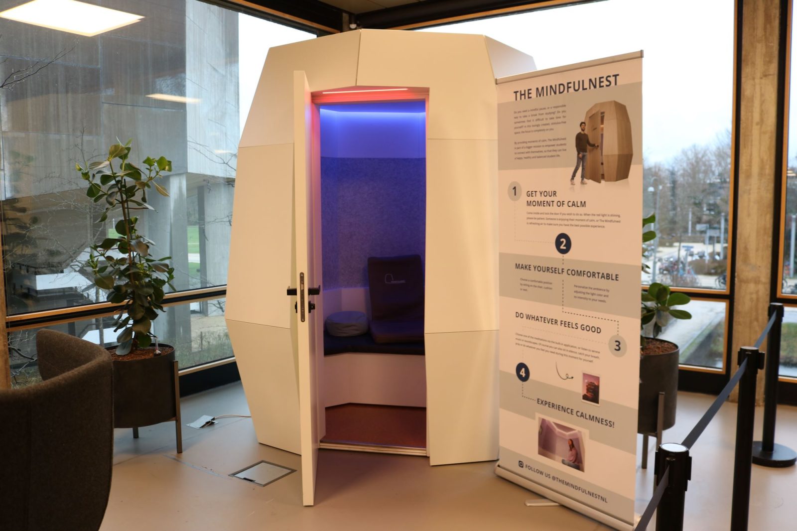 ‘Mindfulnest’, staat er in zwarte letters op de deur. Wanneer Mikail de kleine ruimte binnenstapt en de deur sluit, krijgt hij eerst een ‘vreemd gevoel’. “In de cabine word je geïsoleerd van de wereld, je hoort niets meer van de bibliotheek.” In de kleine ruimte staat een zacht loungebankje, de gekleurde lichten zijn gedimd. Er hangt een lichtzoete bloemengeur. En in de muur zit een tablet met daarop twee keuzes: begeleide of onbegeleide meditatie.